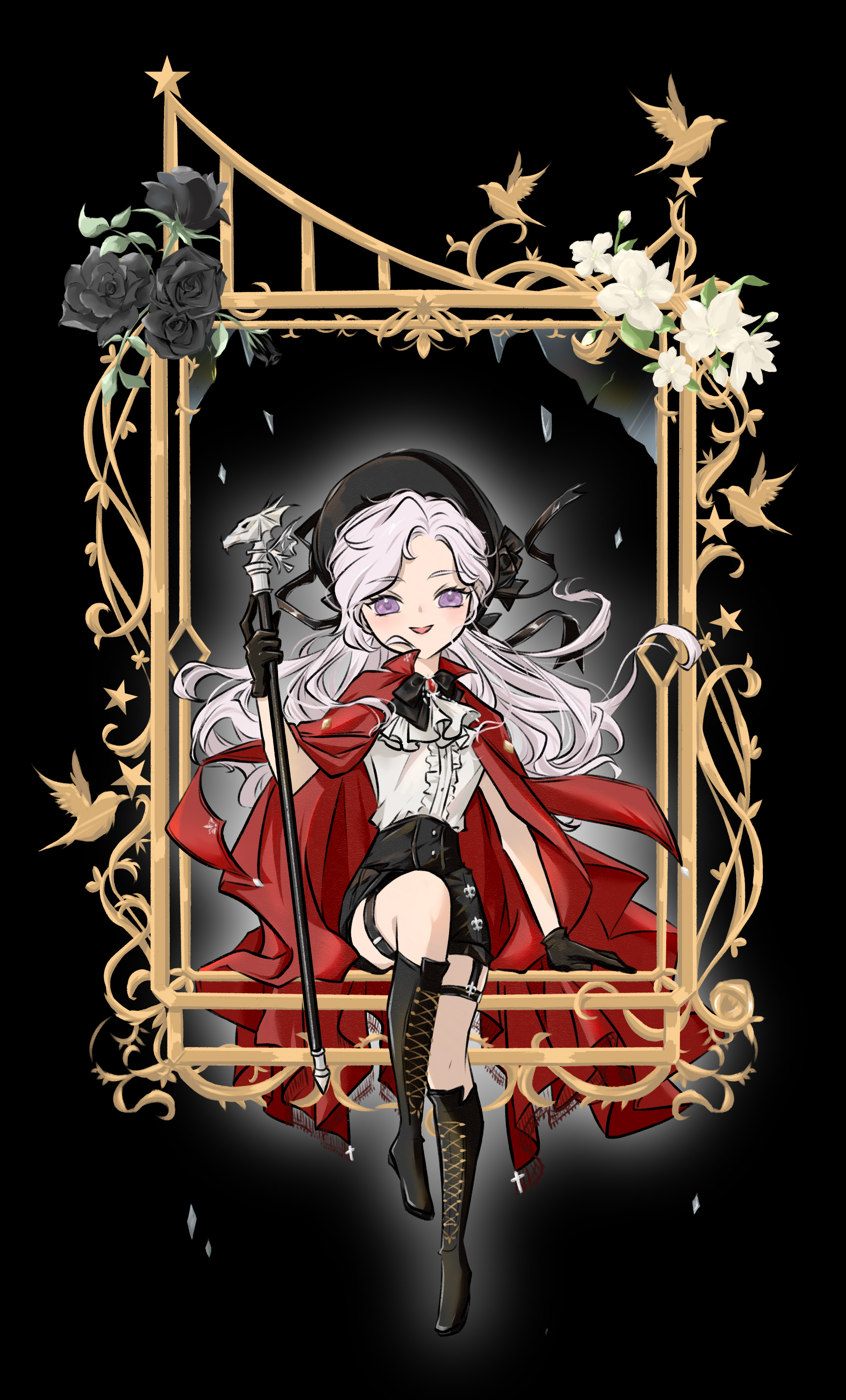 1girl absurdres anabellnordin black_background black_boots black_bow black_bowtie black_flower black_gloves black_hat black_shorts boots bow bowtie cape commentary flower frilled_skirt frills full_body garter_straps gem gloves hat hat_bow high-waist_shorts highres holding holding_staff knee_boots long_cape long_hair open_mouth original purple_eyes red_cape red_gem shirt shorts sitting skirt smile solo staff white_flower white_hair white_shirt