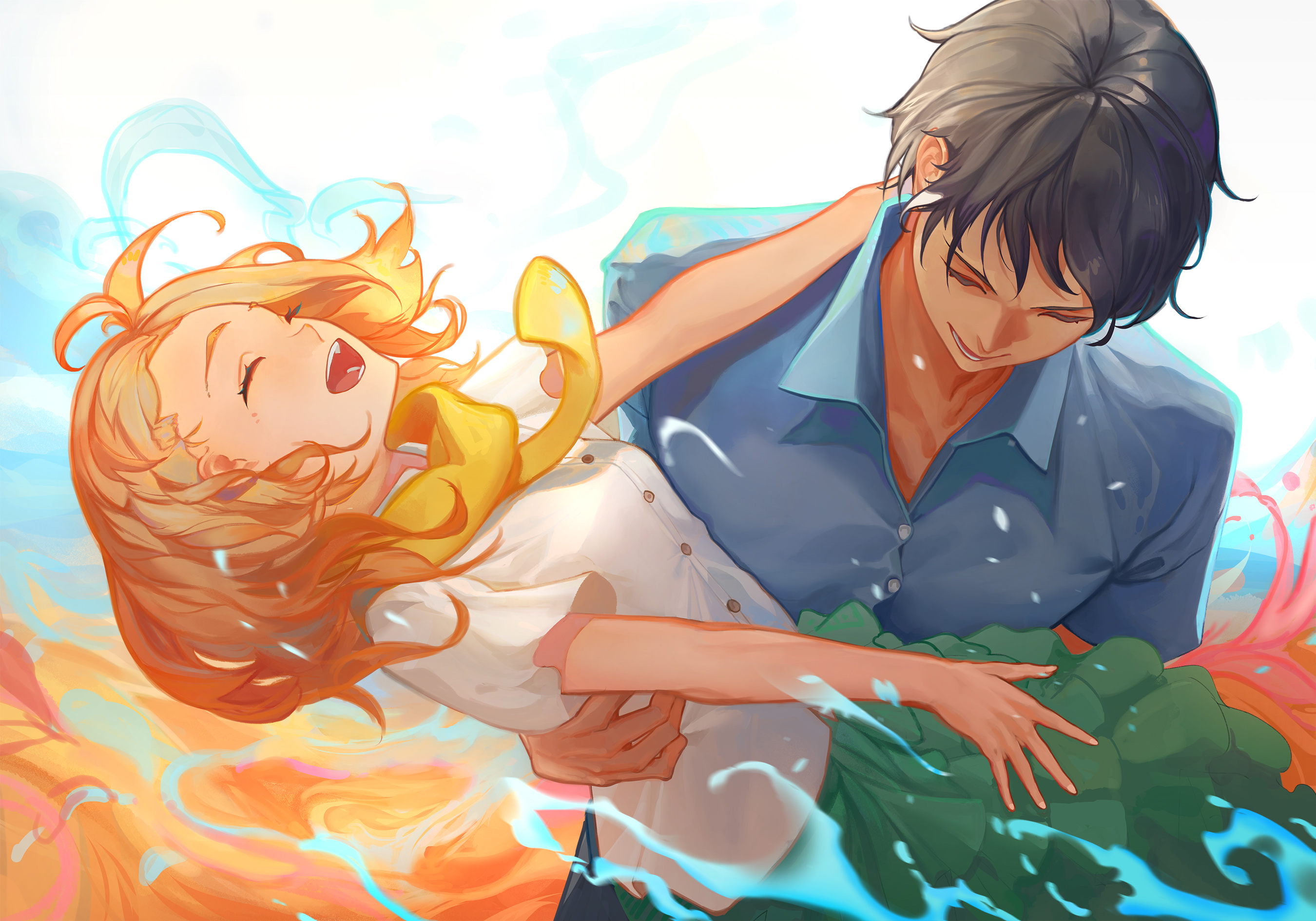 1boy 1girl black_hair blue_shirt brown_hair carrying closed_eyes commentary_request floating_hair green_skirt happy highres josee_(joseetora) josee_to_tora_to_sakana-tachi layered_skirt leaning_back leaning_forward medium_hair open_mouth princess_carry scarf shirt short_hair short_sleeves skirt smile splashing suzukawa_tsuneo white_shirt yellow_scarf zdo-zwei