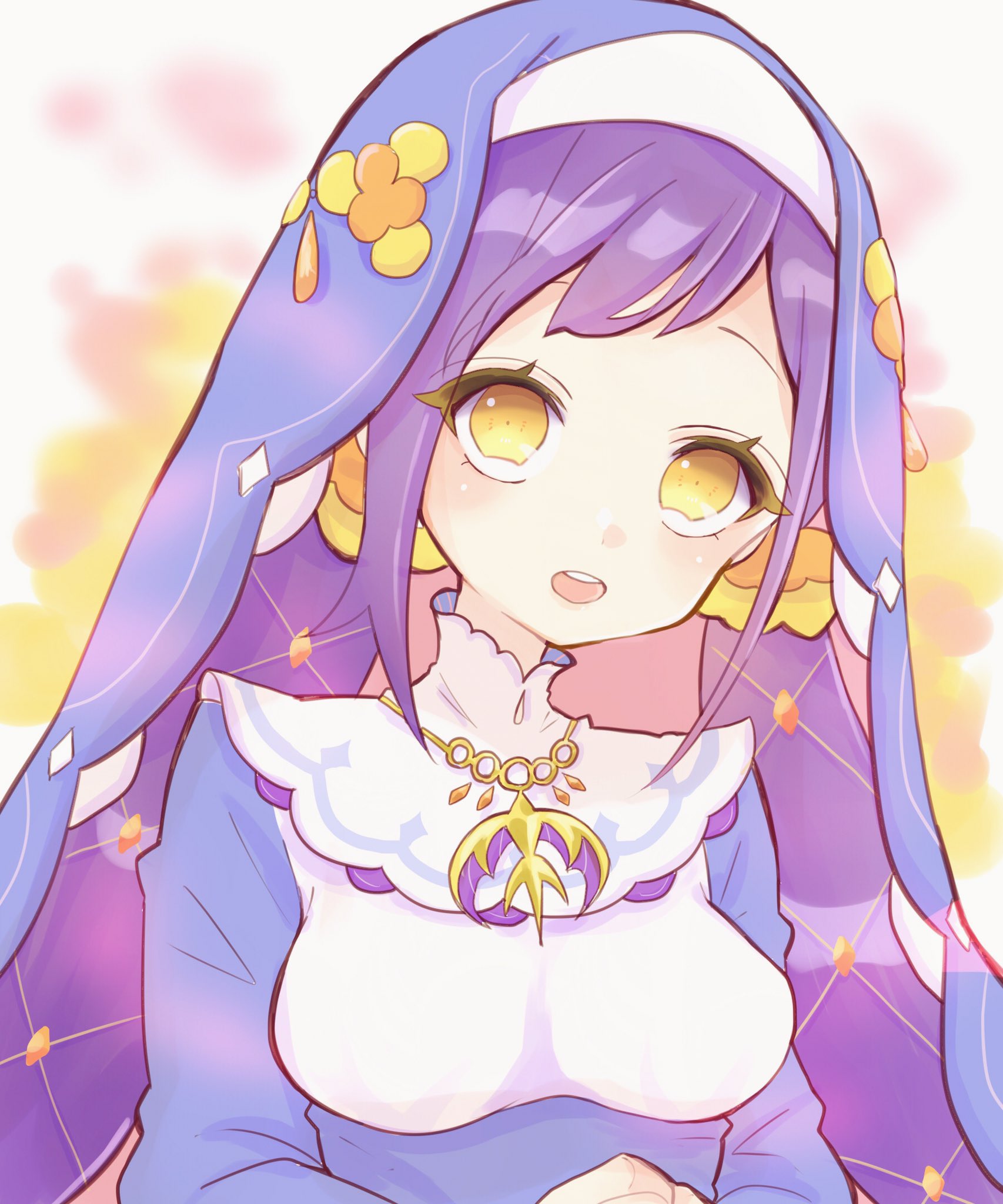 1girl bad_source blue_dress breasts dress highres jewelry long_hair long_sleeves looking_at_viewer medium_breasts melty_pristis necklace nun open_mouth own_hands_clasped own_hands_together purple_hair re:zero_kara_hajimeru_isekai_seikatsu rojiuranoneko smile solo teeth traditional_nun twintails upper_body upper_teeth_only veil yellow_eyes