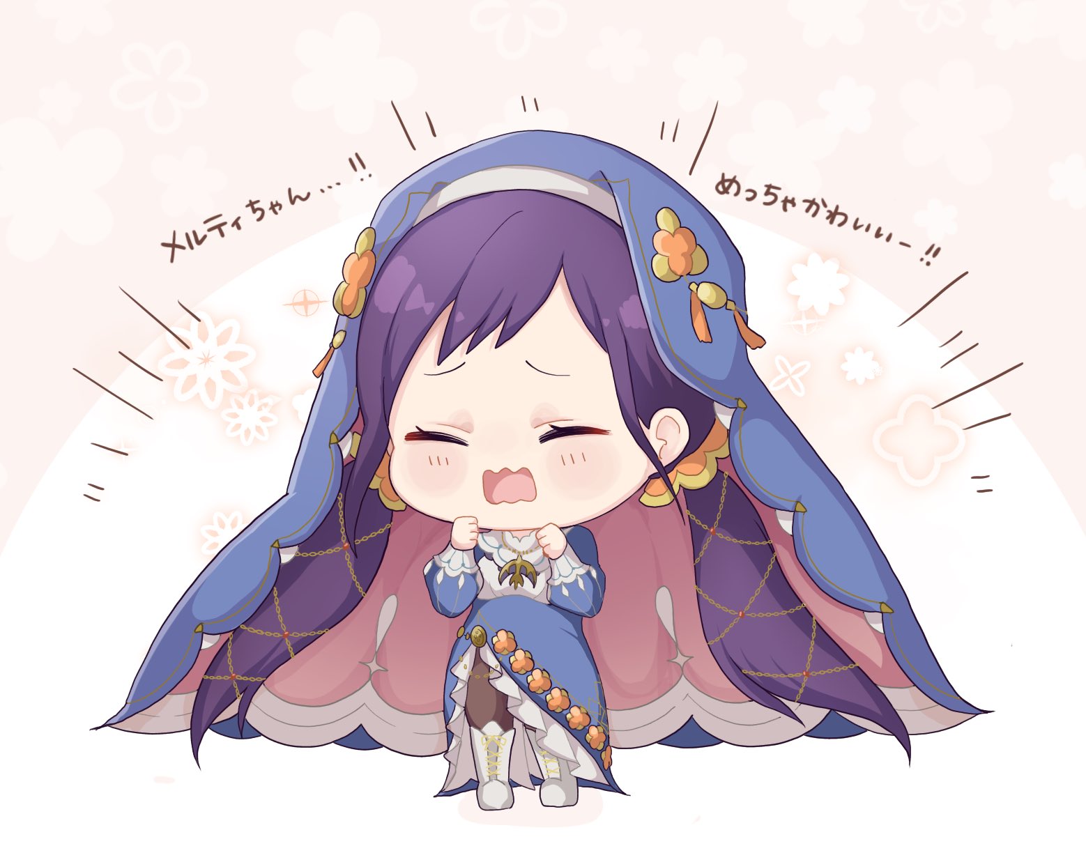 1girl azaz_watamatoz blue_dress blush boots brown_pantyhose chibi clenched_hands closed_eyes dress facing_viewer floral_background full_body hands_up highres jewelry long_hair long_sleeves melty_pristis open_mouth pantyhose purple_hair re:zero_kara_hajimeru_isekai_seikatsu side_slit solo standing twintails two-tone_background veil very_long_hair wavy_mouth white_background