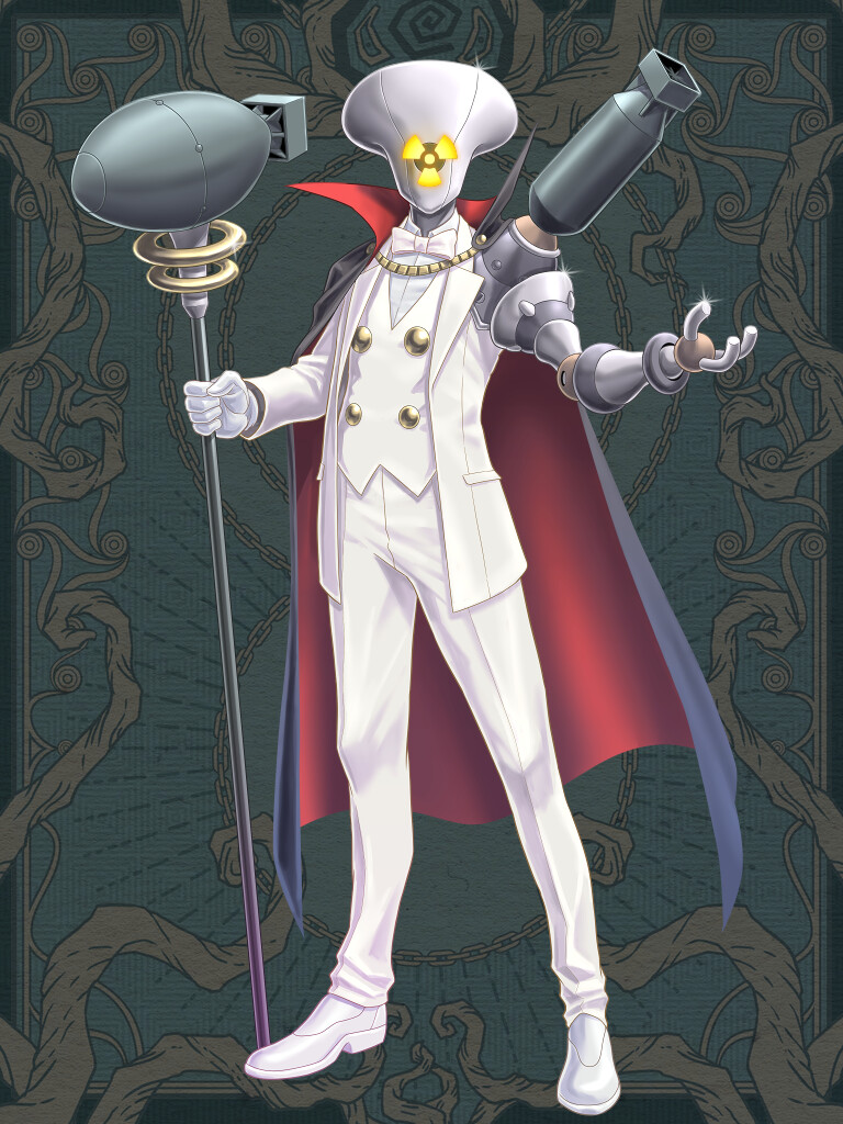 1other black_cape bomb cape chain_paradox claws explosive facing_viewer formal_clothes full_body gloves grey_background mechanical_arms morisawa_tomohiro object_head pants red_cape shoes single_mechanical_arm staff standing suit two-tone_cape vest white_gloves white_pants white_shoes white_suit white_vest