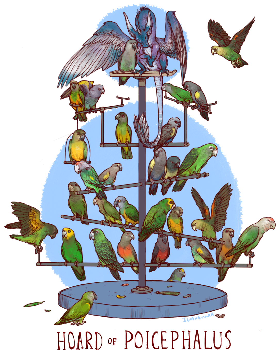 animal artist_name bird blue_background blue_feathers blue_horns blue_scales border closed_eyes commentary creature creature_focus dragon english_commentary english_text fantasy feather_tail feathered_wings feathers flying green_bird green_feathers highres horns iguanamouth no_humans nuzzle original parrot perching red_feathers scientific_name sitting too_many too_many_birds white_border wings yellow_feathers