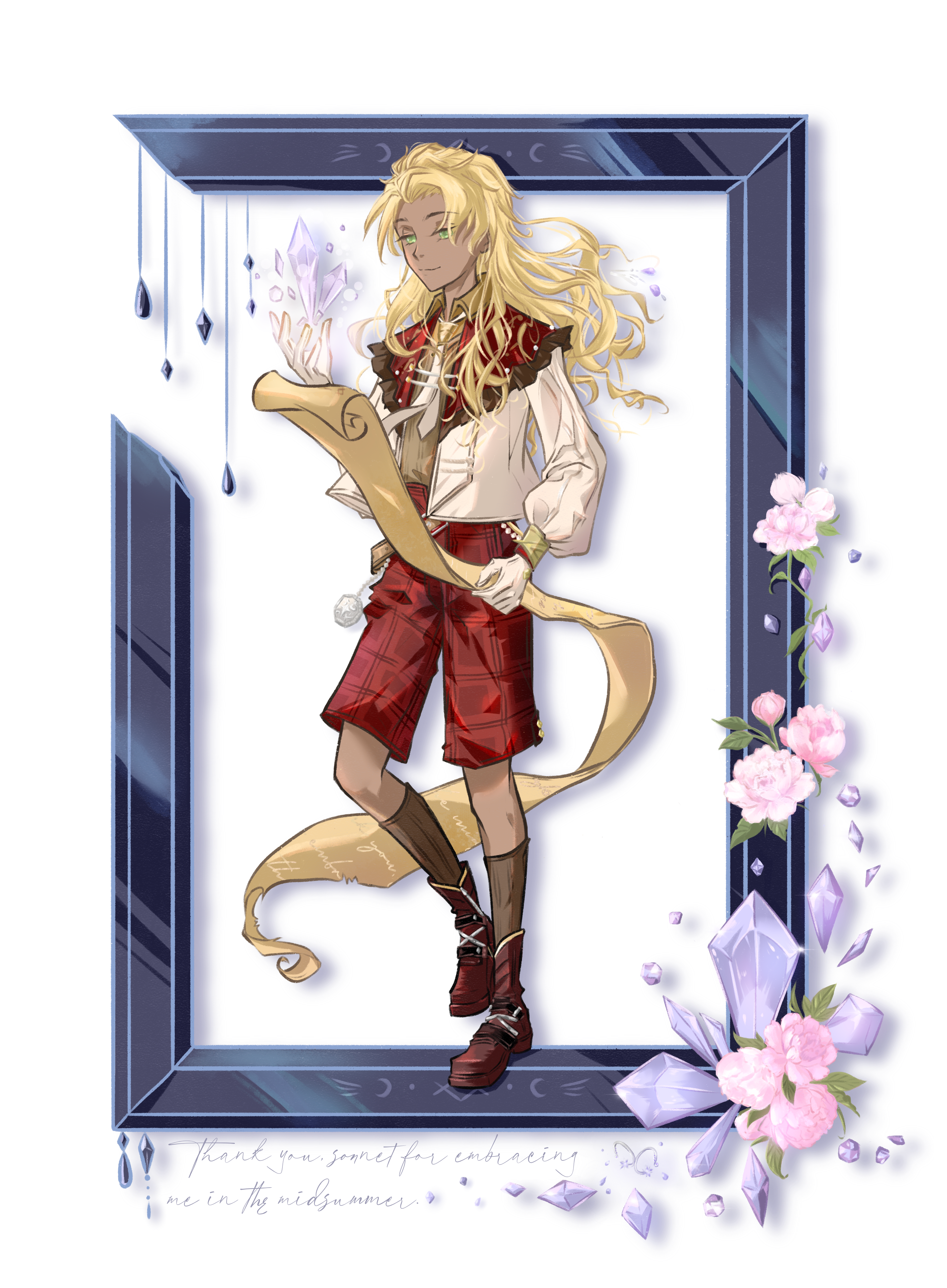 1boy absurdres anabellnordin blonde_hair boots closed_mouth collared_shirt commentary crystal dark-skinned_male dark_skin english_text gloves green_eyes highres holding holding_crystal holding_scroll kneehighs light_smile long_hair long_sleeves looking_at_viewer necktie original red_boots red_shorts scroll shirt shorts socks solo standing standing_on_one_leg white_gloves white_necktie