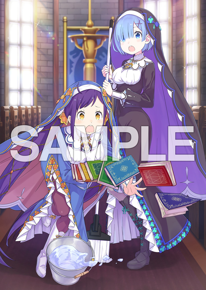 2girls blue_dress blue_eyes blue_hair book boots breasts broom bucket church cross crossover dress hair_ornament hair_over_one_eye holding indoors long_hair long_sleeves medium_breasts melty_pristis mop multiple_girls nun official_art ootsuka_shin'ichirou open_mouth pantyhose purple_hair re:zero_kara_hajimeru_isekai_seikatsu rem_(re:zero) sample_watermark short_hair stained_glass standing teeth tripping very_long_hair watermark window x_hair_ornament yellow_eyes