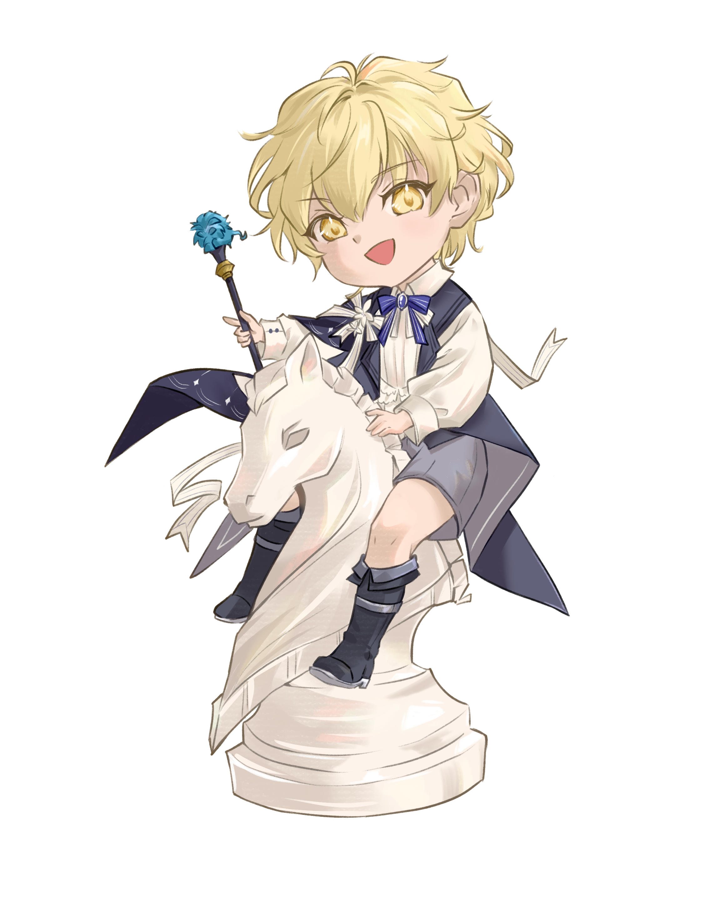 1boy absurdres anabellnordin black_boots blonde_hair blue_bow blue_bowtie blue_gem boots bow bowtie chess_piece collared_shirt gem grey_shorts highres holding holding_staff horseback_riding knee_boots knight_(chess) long_sleeves original riding shirt short_hair shorts solo staff white_shirt yellow_eyes