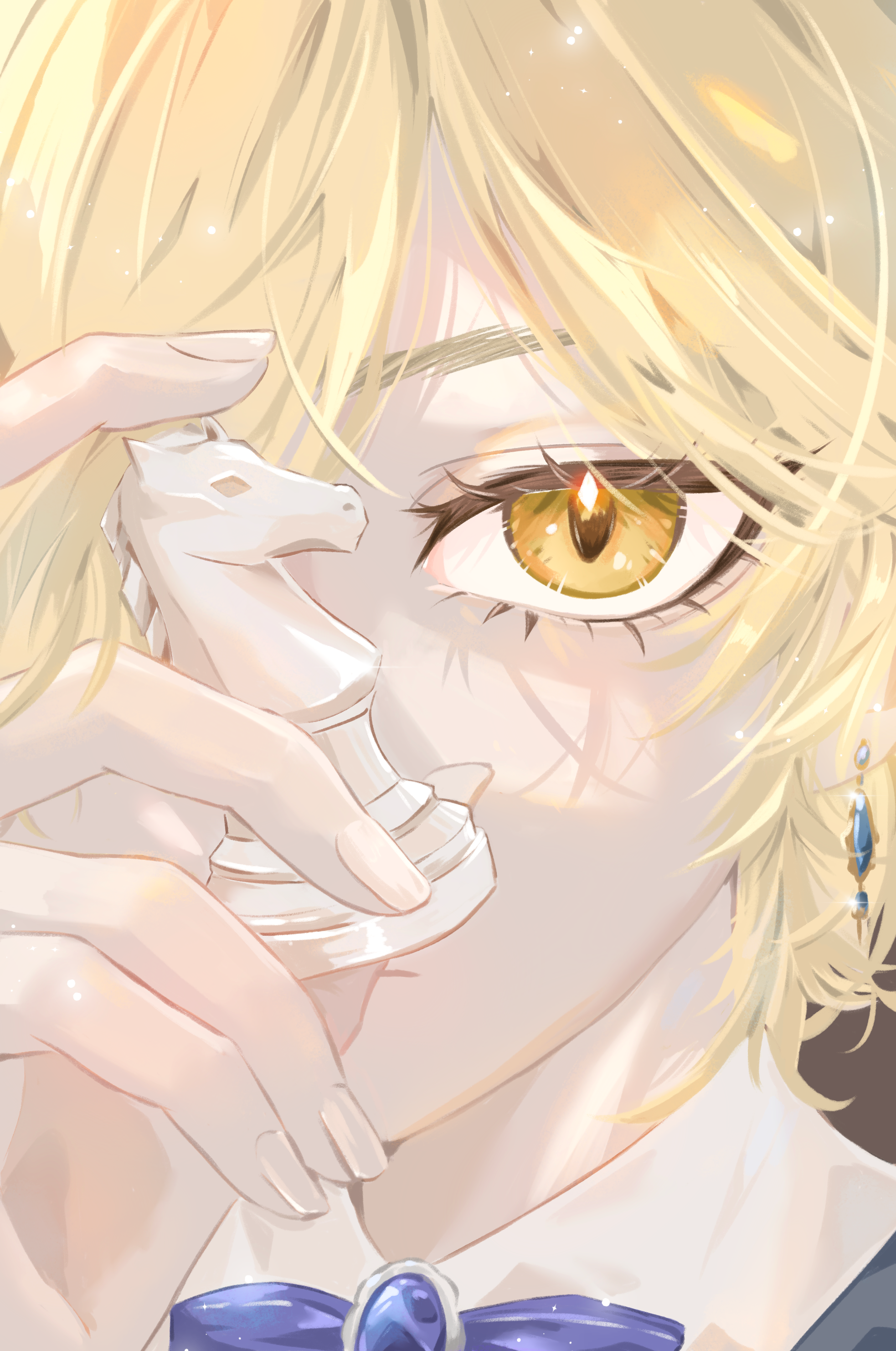 absurdres anabellnordin blonde_hair blue_bow blue_bowtie blue_gem bow bowtie chess_piece earrings eye_focus eyelashes gem gender_request highres holding holding_chess_piece jewelry knight_(chess) original short_hair yellow_eyes