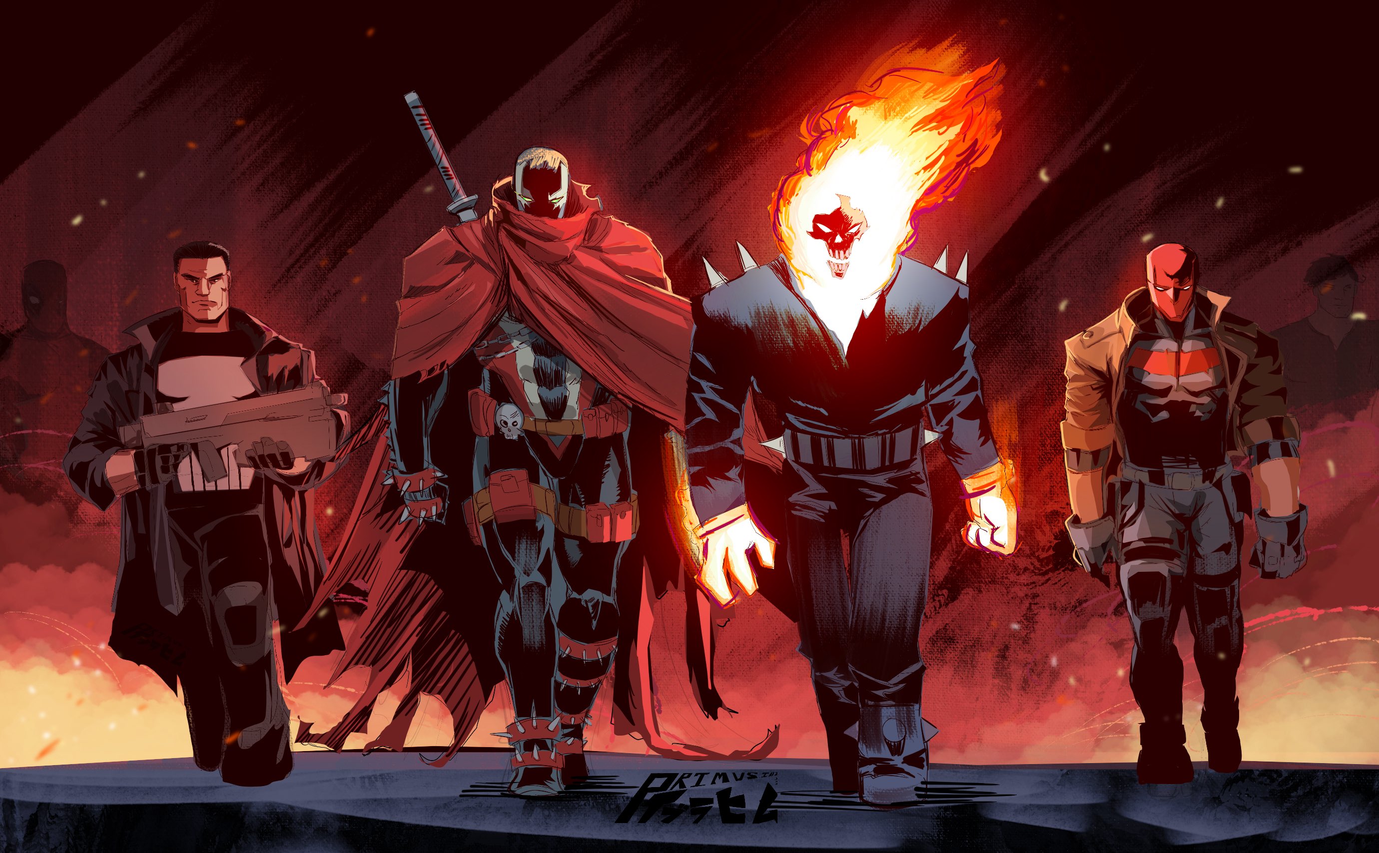 batman_(series) cape chain dc_comics demon fire ghost_rider ghost_rider_(series) glowing glowing_eyes gun highres holding holding_gun holding_weapon male_focus marvel mask multiple_boys primusibi red_cape red_hood_(dc) spawn_(comic) spawn_(spawn) spikes superhero_costume sword the_punisher_(character) the_punisher_(series) weapon