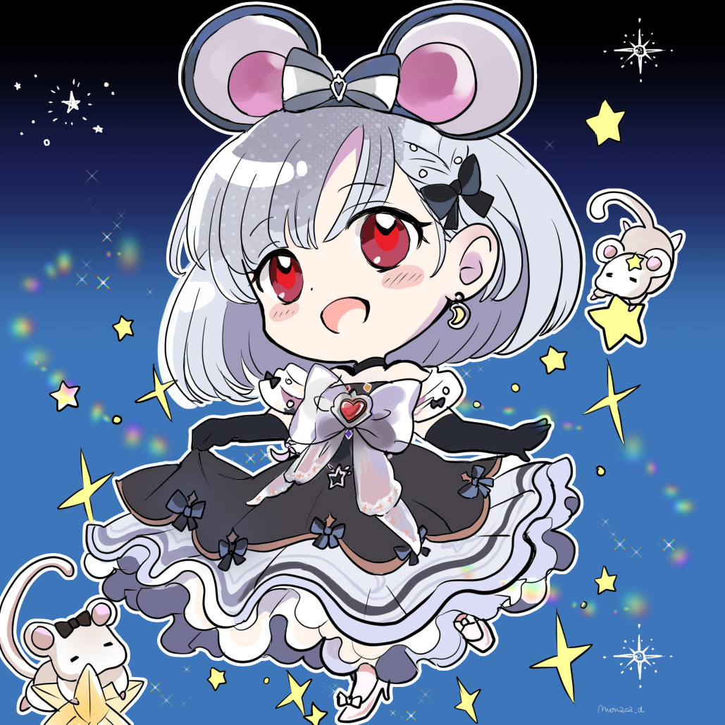 1girl animal_ears bare_shoulders black_choker black_dress black_gloves black_ribbon blush chibi chibi_only choker clothes_lift dress elbow_gloves fake_animal_ears gloves granblue_fantasy high_heels monaca_d mouse_(animal) mouse_ears off-shoulder_dress off_shoulder red_eyes ribbon skirt skirt_lift smile solo star_(sky) vikala_(12th_anniversary) vikala_(granblue_fantasy) white_hair