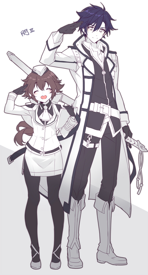 1boy 1girl achan_(blue_semi) black_gloves black_pantyhose blue_eyes brown_hair coat eiyuu_densetsu garrison_cap gloves hat long_hair looking_at_viewer low_ponytail pantyhose partially_colored pencil_skirt ponytail rean_schwarzer salute sen_no_kiseki sen_no_kiseki_(series) sen_no_kiseki_iii short_hair side_slit skirt smile tachi_(weapon) towa_herschel