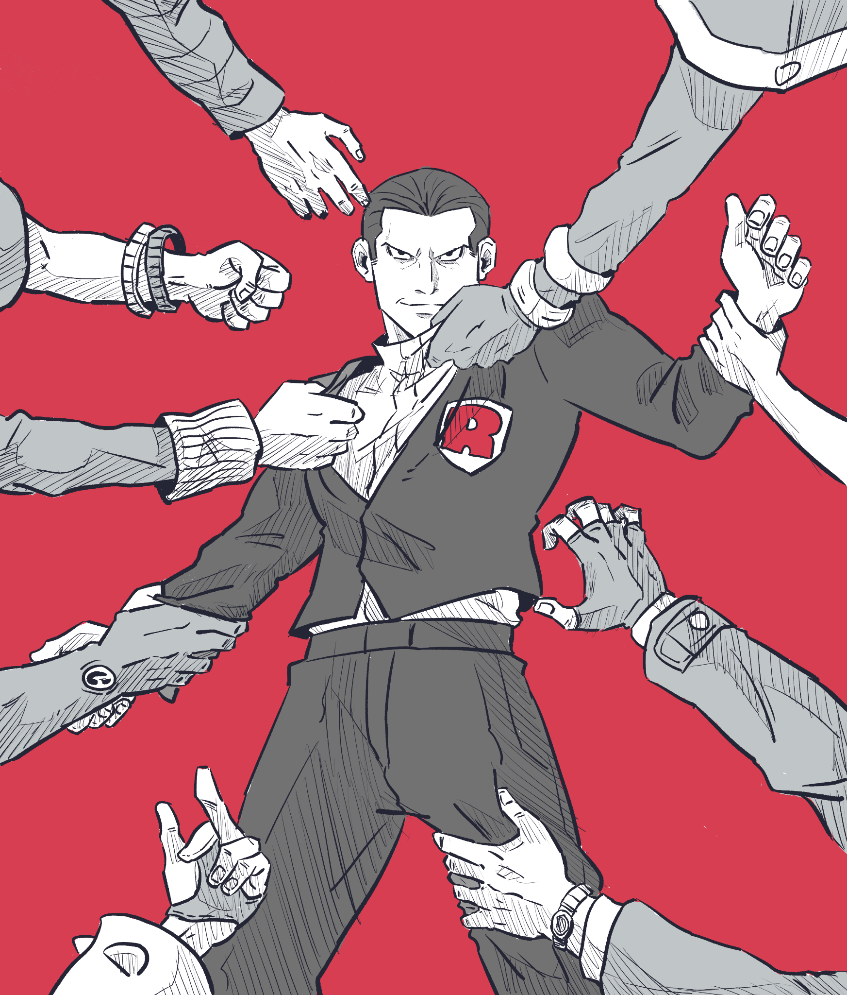 1girl 6+boys archie_(pokemon) barbwalken clenched_hand cyrus_(pokemon) fingerless_gloves ghetsis_(pokemon) giovanni_(pokemon) gloves greyscale_with_colored_background guzma_(pokemon) highres looking_at_viewer lusamine_(pokemon) lysandre_(pokemon) male_focus maxie_(pokemon) middle_finger multiple_boys nintendo piers_(pokemon) pokemon pokemon_black_2_and_white_2 pokemon_diamond/pearl/platinum pokemon_masters_ex pokemon_omega_ruby_and_alpha_sapphire pokemon_sun_and_moon pokemon_sword_and_shield pokemon_x_and_y pulling_another's_clothes red_background rose_(pokemon) solo_focus team_rocket watch wristband wristwatch