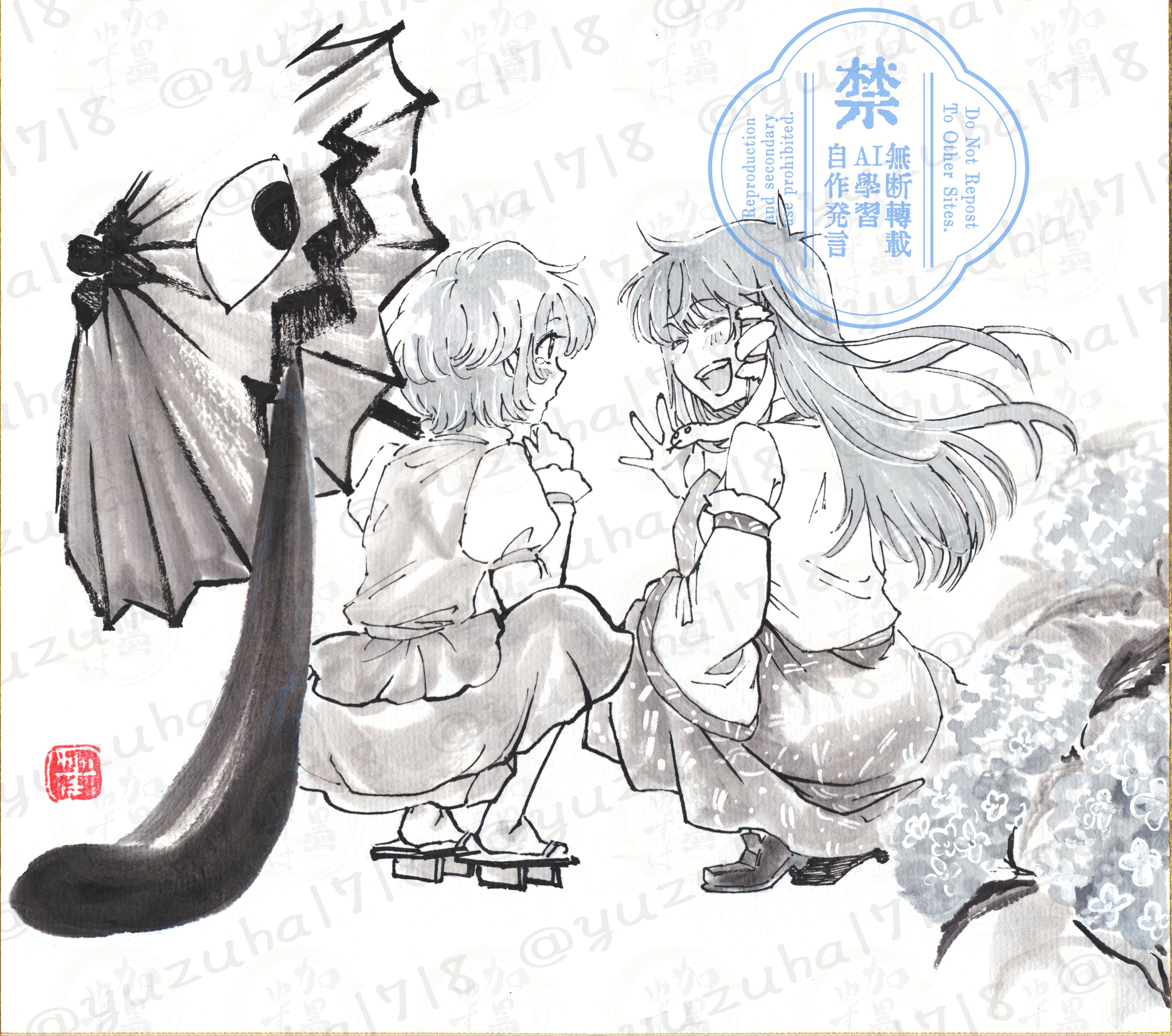 2girls absurdres commentary detached_sleeves english_commentary geta greyscale hair_ornament hair_tubes highres holding holding_umbrella juliet_sleeves karakasa_obake kochiya_sanae long_hair long_sleeves mixed-language_commentary monochrome multiple_girls open_mouth puffy_sleeves shikishi single_hair_tube skirt smile snake_hair_ornament squatting tatara_kogasa touhou traditional_media twitter_username umbrella vest watermark watermark_grid yuzuha_(yuzutime)