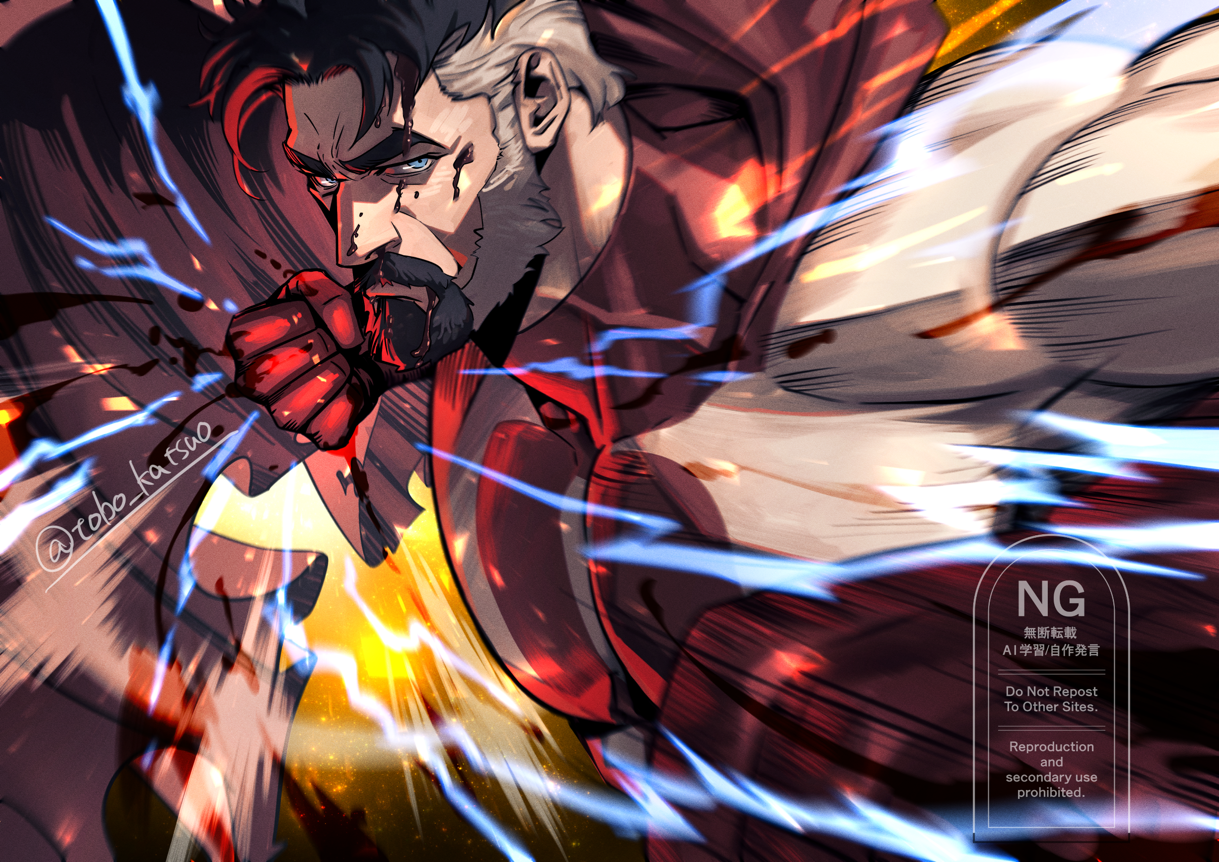 1boy artist_name beard black_hair blue_eyes bodysuit cape commentary_request facial_hair fire gloves grey_hair highres incoming_attack invincible_(series) looking_at_viewer male_focus multicolored_hair nolan_grayson omni-man red_cape red_gloves sample_watermark superhero_costume tobo_katsuo twitter_username watermark white_bodysuit