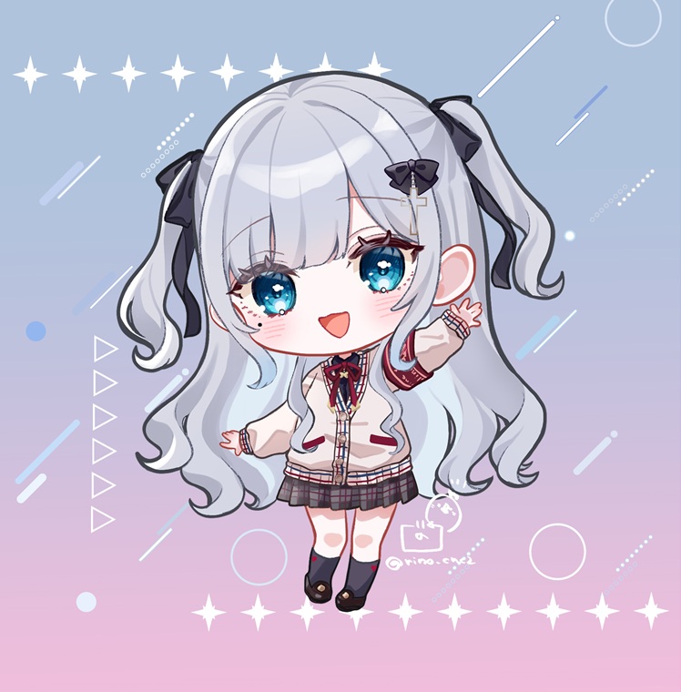 1girl armband black_bow black_ribbon black_shirt black_shoes black_socks blue_background blue_eyes blush bow brown_jacket chibi chibi_only collared_shirt cross_hair_ornament full_body gradient_background grey_hair grey_skirt hair_bow hair_ornament hair_ribbon jacket kaga_sumire kneehighs long_hair long_sleeves looking_at_viewer mole mole_under_eye neck_ribbon open_mouth pigeon-toed pink_background plaid_clothes plaid_skirt pleated_skirt red_armband red_ribbon ribbon rino_cnc school_uniform shirt shoes skirt smile socks solo two_side_up virtual_youtuber vspo! waving
