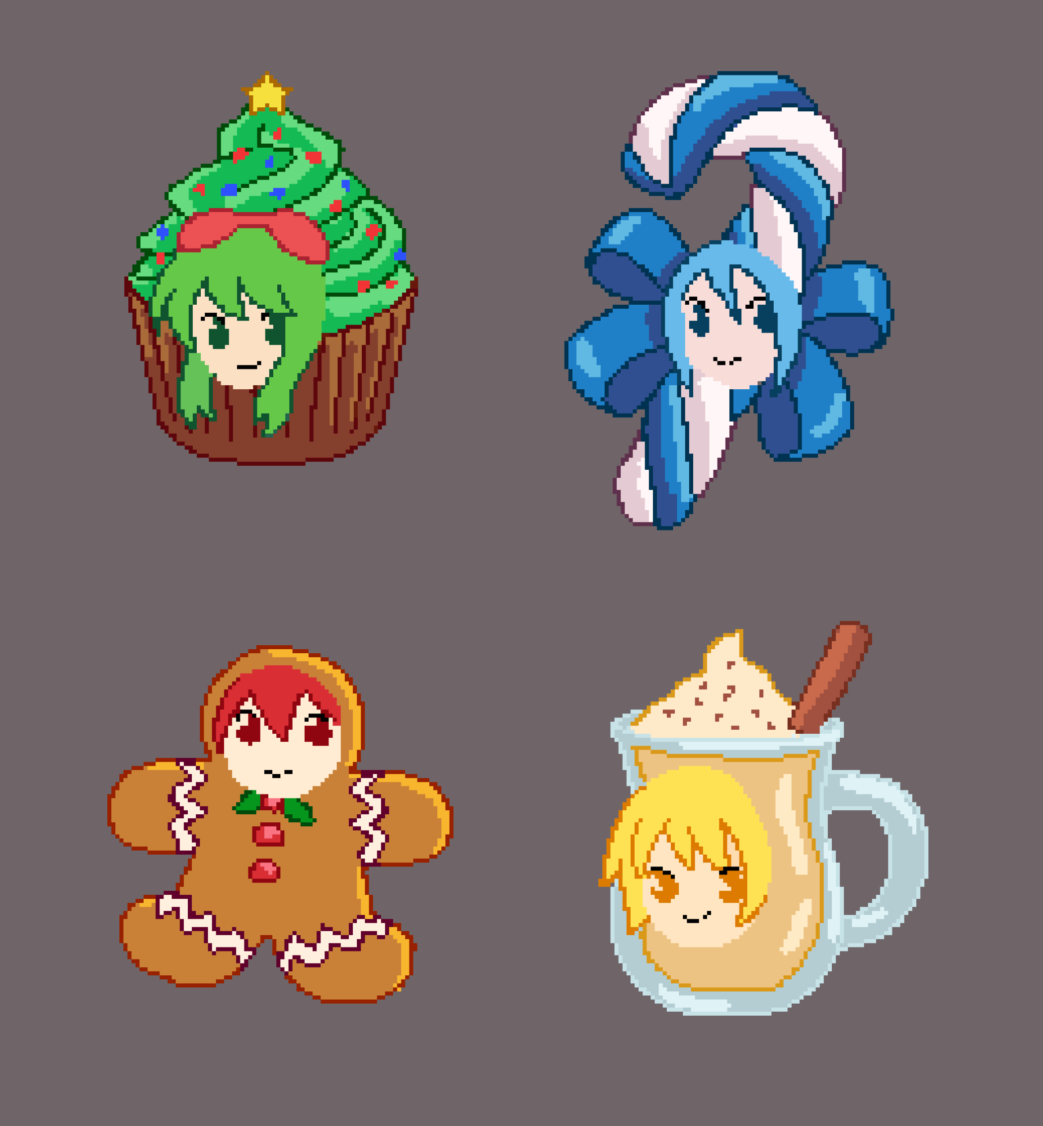 4girls akita_neru aqua_eyes aqua_hair azula_diana blonde_hair candy candy_cane closed_mouth commentary cup cupcake drink english_commentary food foodification gingerbread_man green_eyes green_hair grey_background gumi hair_between_eyes hatsune_miku highres kasane_teto mug multiple_girls red_eyes red_hair simple_background smile split_mouth utau vocaloid whipped_cream yellow_eyes