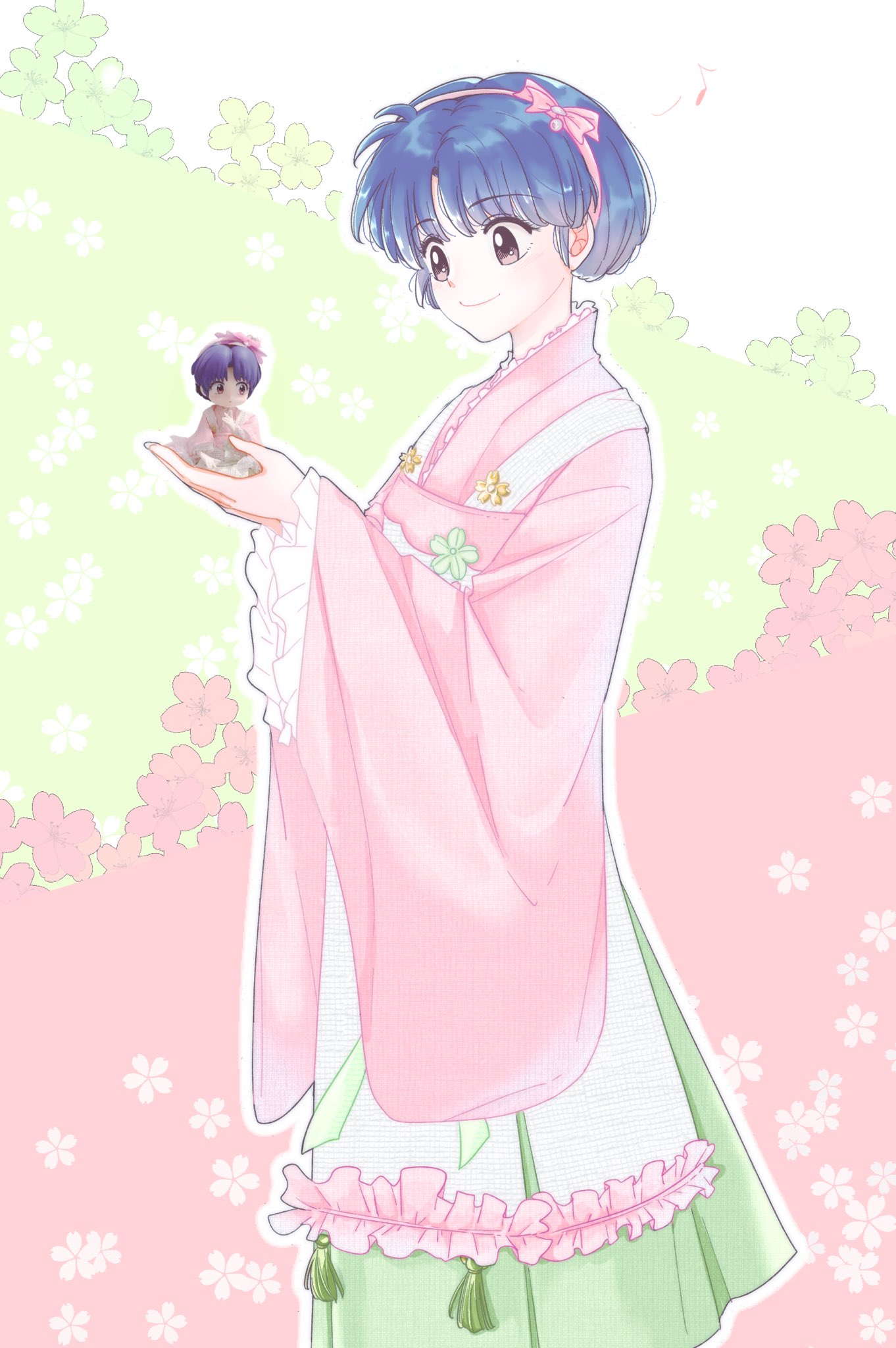 1girl akarinaakari blue_hair blue_hairband character_doll closed_mouth commentary doll floral_background hairband highres japanese_clothes kimono pale_skin pink_eyes pink_kimono ranma_1/2 short_hair smile solo tendou_akane untranslatable_commentary