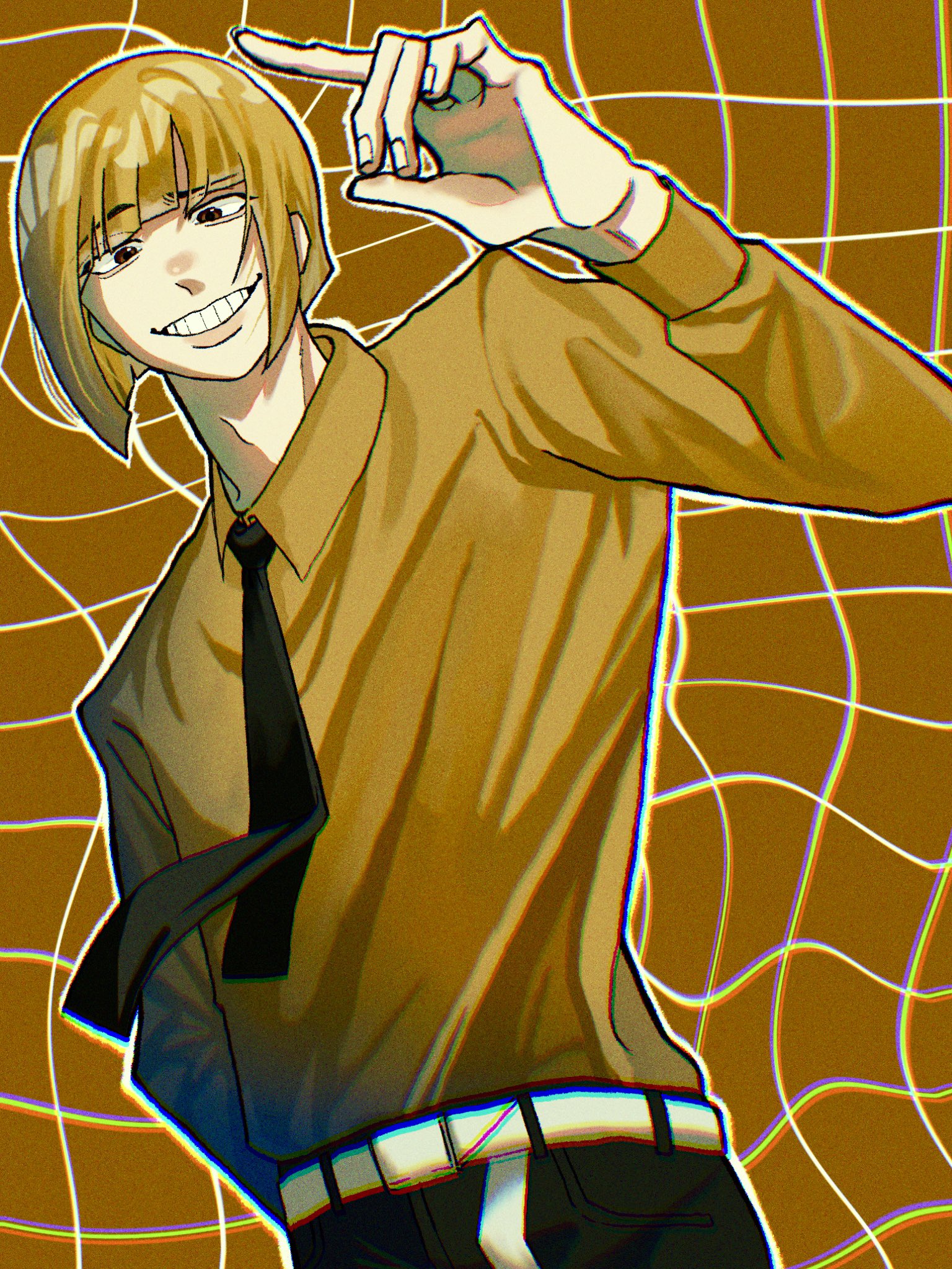 1boy belt black_necktie black_pants bleach blonde_hair blunt_bangs brown_background brown_eyes brown_shirt collared_shirt grid_background grin highres hirako_shinji looking_at_viewer male_focus necktie pants parted_lips shirt short_hair smile solo teeth touv_va upper_body white_belt