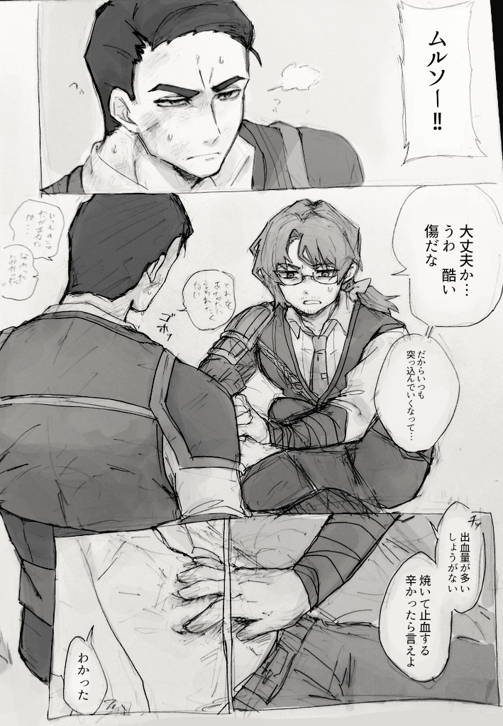2boys absurdres alternate_costume amputee angry armor bandaged_arm bandages beard_stubble belt bleeding blood bow breath bruise closed_mouth clothes_lift collared_shirt comic cuts dress_shirt expressionless eyes_visible_through_hair facial_hair formal_clothes from_behind from_side frown gauntlets glaring glasses graphite_(medium) gregor_(project_moon) greyscale hair_bow hair_ribbon hand_on_another's_stomach highres injury jitome joints kneeling limbus_company liu_association_south_uniform long_hair long_sleeves looking_at_another looking_down looking_to_the_side low_ponytail male_focus mechanical_arms meursault_(project_moon) monochrome multiple_boys necktie official_alternate_costume pants parted_bangs parted_lips photoshop_(medium) ponytail project_moon prosthesis prosthetic_arm ribbon sanpaku semi-rimless_eyewear shirt shirt_lift short_hair shoulder_armor sigh simple_background single_mechanical_arm sitting sketch sleeves_rolled_up speech_bubble strap stubble suit sweat sweatdrop talking tie_clip toned toned_male traditional_media under-rim_eyewear upper_body vest yaoi