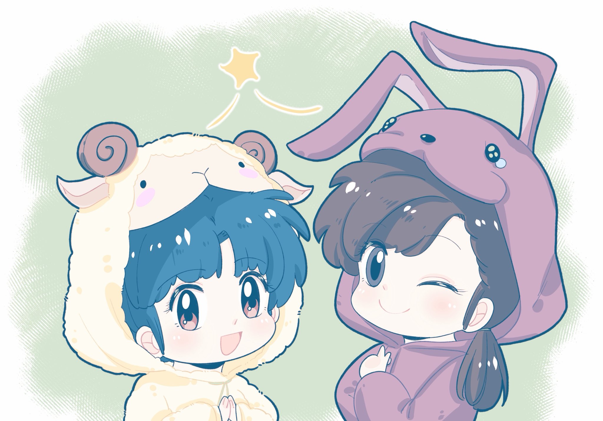 2girls ;) akarinaakari animal_costume animal_hood blue_hair chibi chibi_only chinese_commentary commentary_request green_background highres hood kuonji_ukyou low_ponytail multiple_girls one_eye_closed onesie pale_skin ponytail rabbit_hood ranma_1/2 sheep_costume sheep_hood short_hair smile tendou_akane