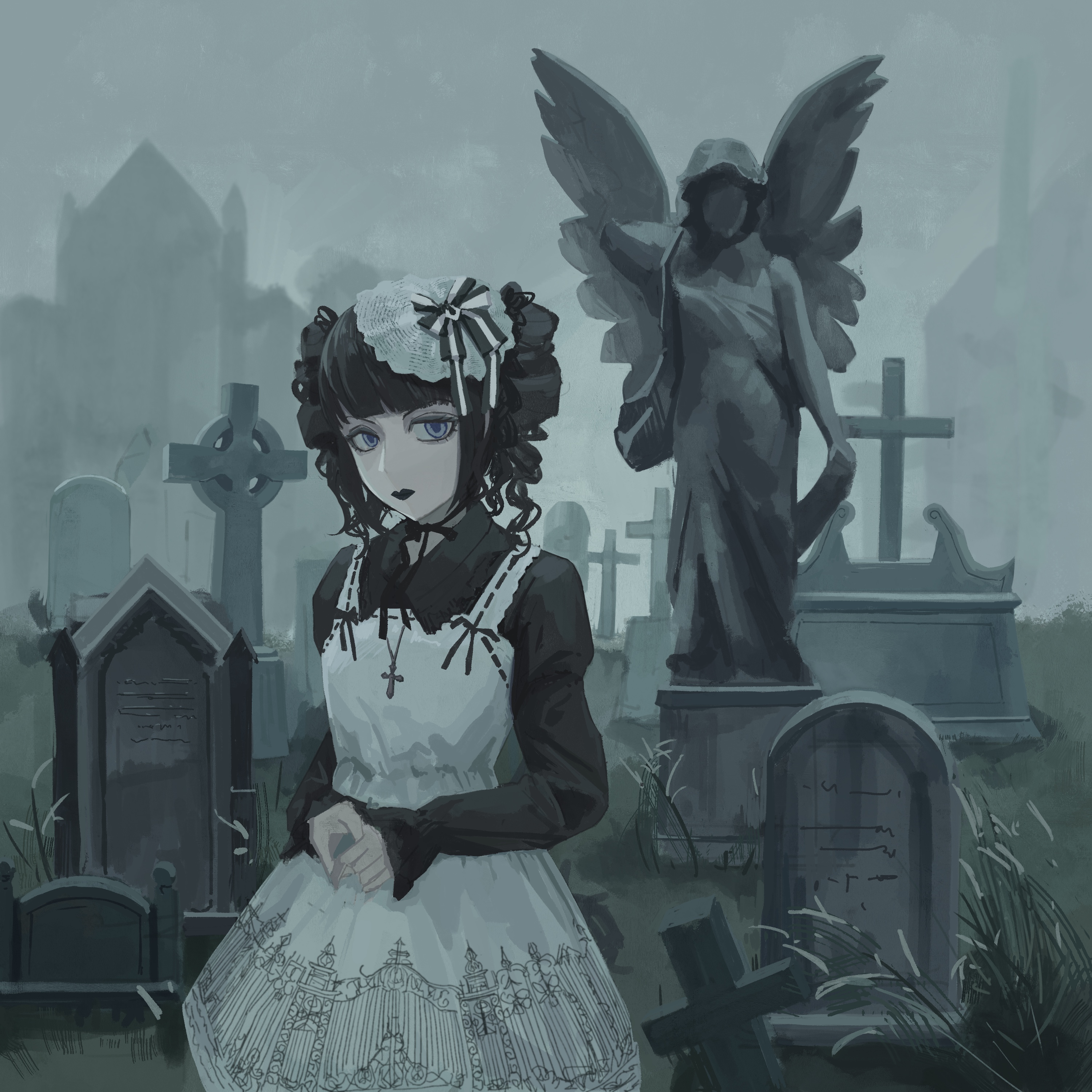 1girl absurdres angel_statue black_hair black_lips black_shirt blue_eyes character_request closed_mouth cloud cloudy_sky commentary_request cowboy_shot cross cross_necklace dress drill_hair goth_fashion grass graveyard highres jewelry long_sleeves looking_at_viewer malice_mizer necklace outdoors own_hands_together shaluoluo shirt short_hair sky sleeveless sleeveless_dress sleeves_past_wrists solo standing tombstone twin_drills white_dress