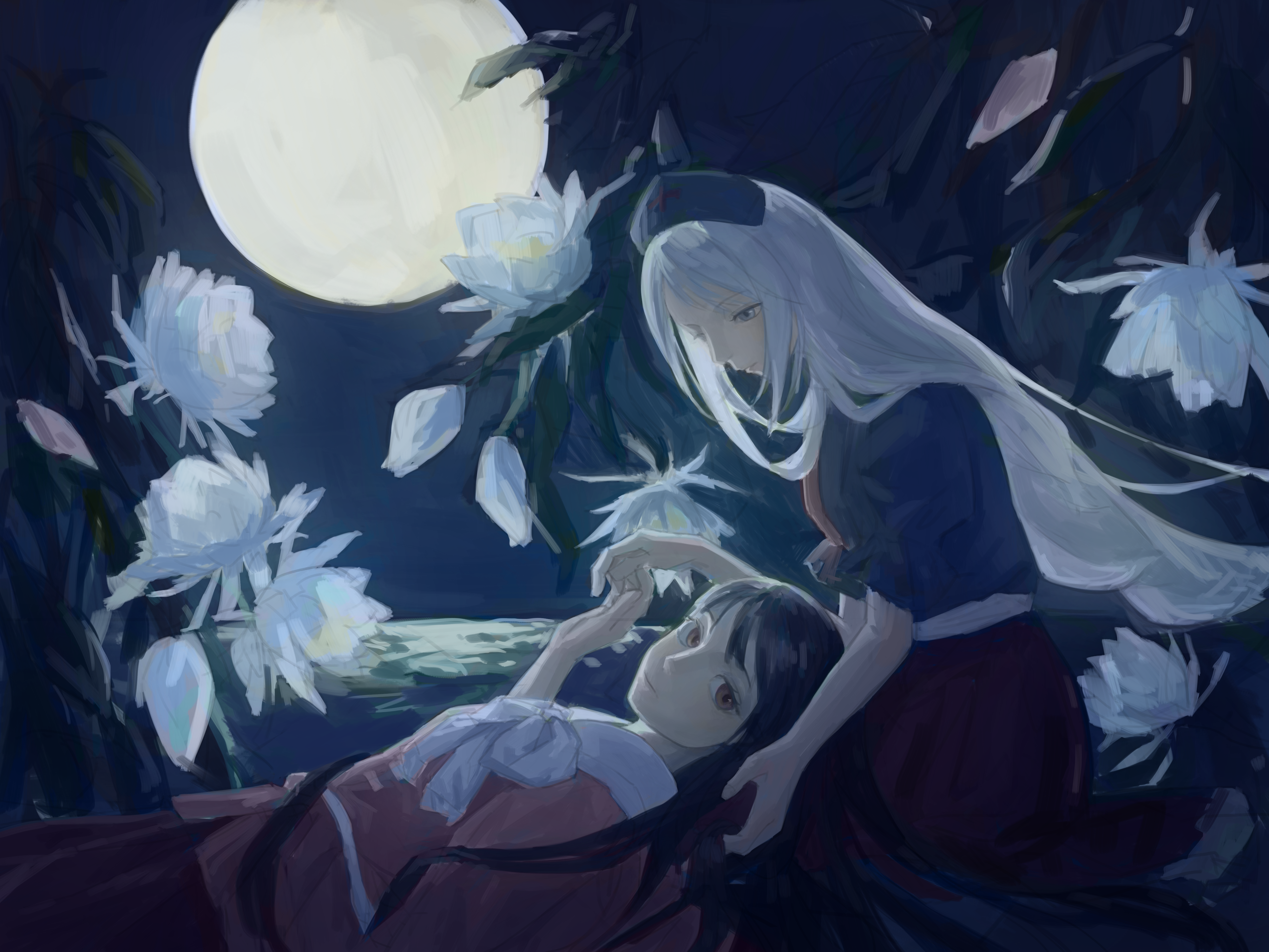 2girls absurdres black_hair closed_mouth commentary_request flower frilled_sleeves frills grey_eyes hand_up hat head_down highres houraisan_kaguya long_hair looking_at_another lying moon multiple_girls night nurse_cap on_back on_lap outdoors pink_shirt puffy_short_sleeves puffy_sleeves red_skirt shaluoluo shirt short_sleeves sitting skirt touhou turning_head very_long_hair water white_flower white_hair yagokoro_eirin