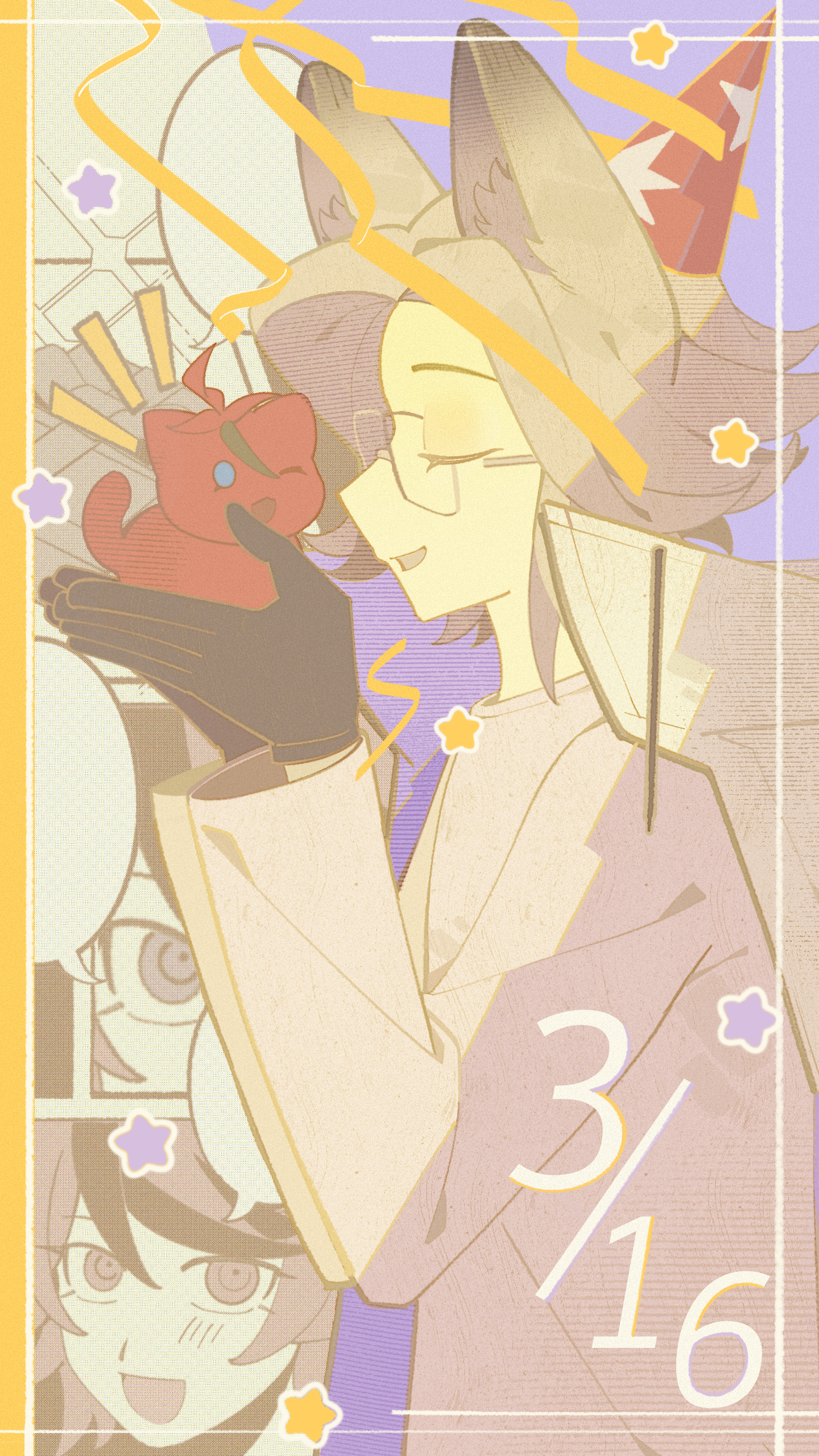 1boy :d absurdres ahoge animal animal_ears animalization aotsuki_eito black_gloves black_streaks blue_eyes cat chinese_commentary commentary_request dated facing_animal glasses gloves grey_hair hat highres holding holding_animal holding_cat jacket jacket_on_shoulders kemonomimi_mode male_focus multicolored_hair one_eye_closed open_mouth party_hat purple_eyes short_hair smile solid_eyes streaked_hair sumino_takumi the_hundred_line_-last_defense_academy- variant_set white_jacket zheidaxuewoshifeishangbukema