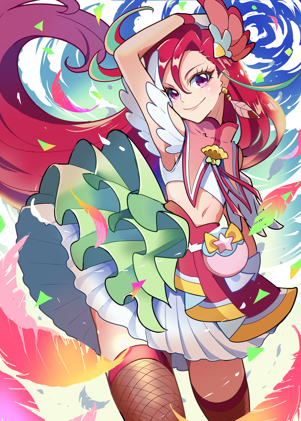 1girl arm_up armpits black_thighhighs blue_sky brooch commentary cowboy_shot cure_flamingo day earrings feather_earrings feather_hair_ornament feathers hair_ornament highres jewelry layered_skirt long_hair midriff miniskirt navel outdoors pact_holder precure purple_eyes red_hair red_shirt red_skirt ryokuchamura shell_brooch shirt showgirl_skirt skirt sky sleeveless sleeveless_shirt solo takizawa_asuka thighhighs tropical-rouge!_precure very_long_hair waves