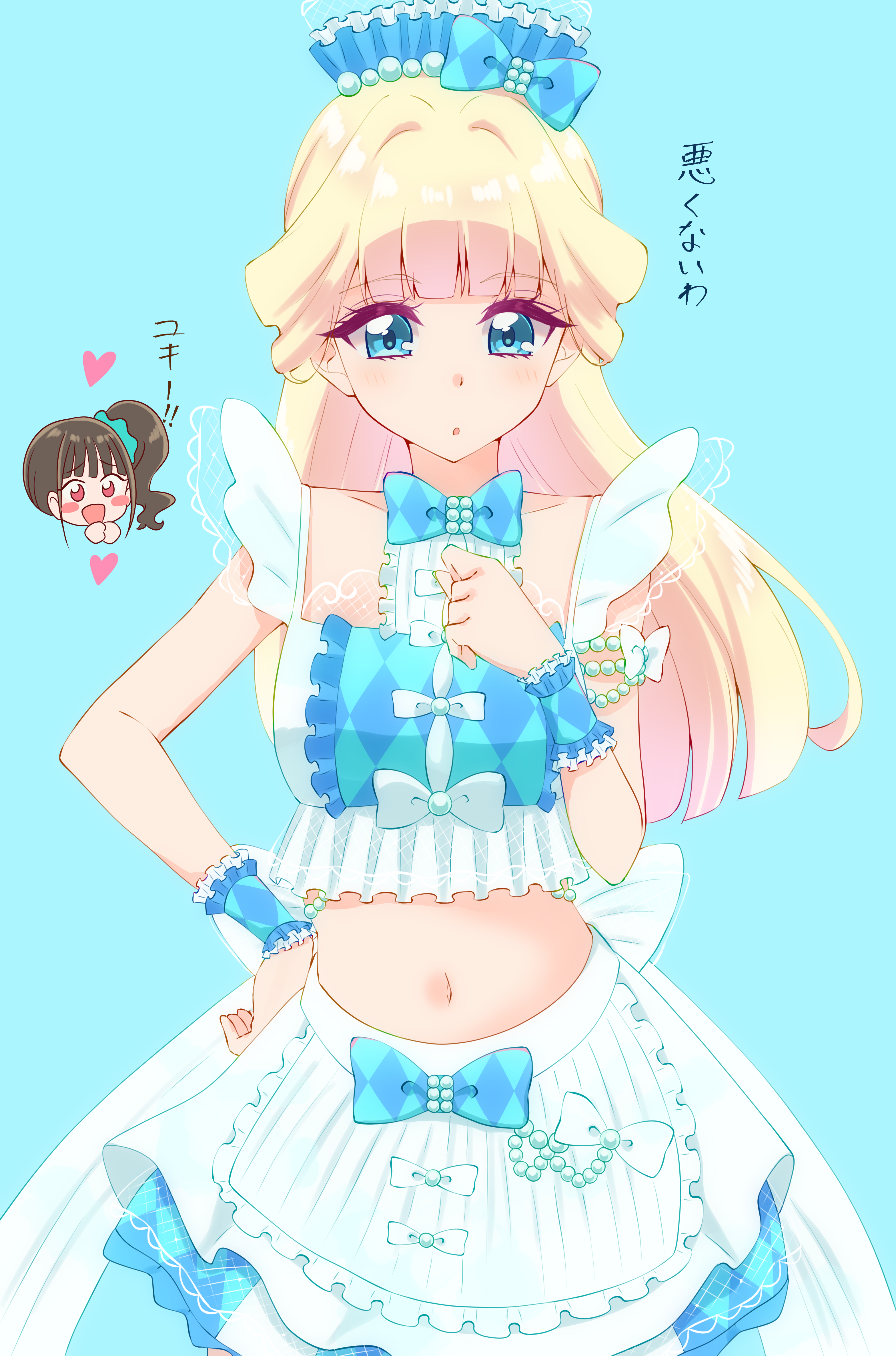 2girls absurdres back_bow blonde_hair blue_background blue_bow blue_bowtie blue_eyes blue_ribbon blue_shirt blue_skirt blunt_bangs bow bowtie breasts commentary cowboy_shot cropped_shirt dress frilled_cuffs frilled_dress frills hair_bow hair_intakes hair_ribbon half_updo hand_on_own_hip heart highres kiratto_pri_chan long_hair looking_at_another midriff multiple_girls navel nekoyashiki_mayu nekoyashiki_yuki open_mouth parted_lips precure pretty_series ribbon shirt side_ponytail simple_background skirt small_breasts smile speech_bubble spoken_heart standing sugimura_mickey summer_maid_coord tiara translated two-tone_shirt two-tone_skirt white_bow white_dress white_shirt white_skirt wonderful_precure! wrist_cuffs