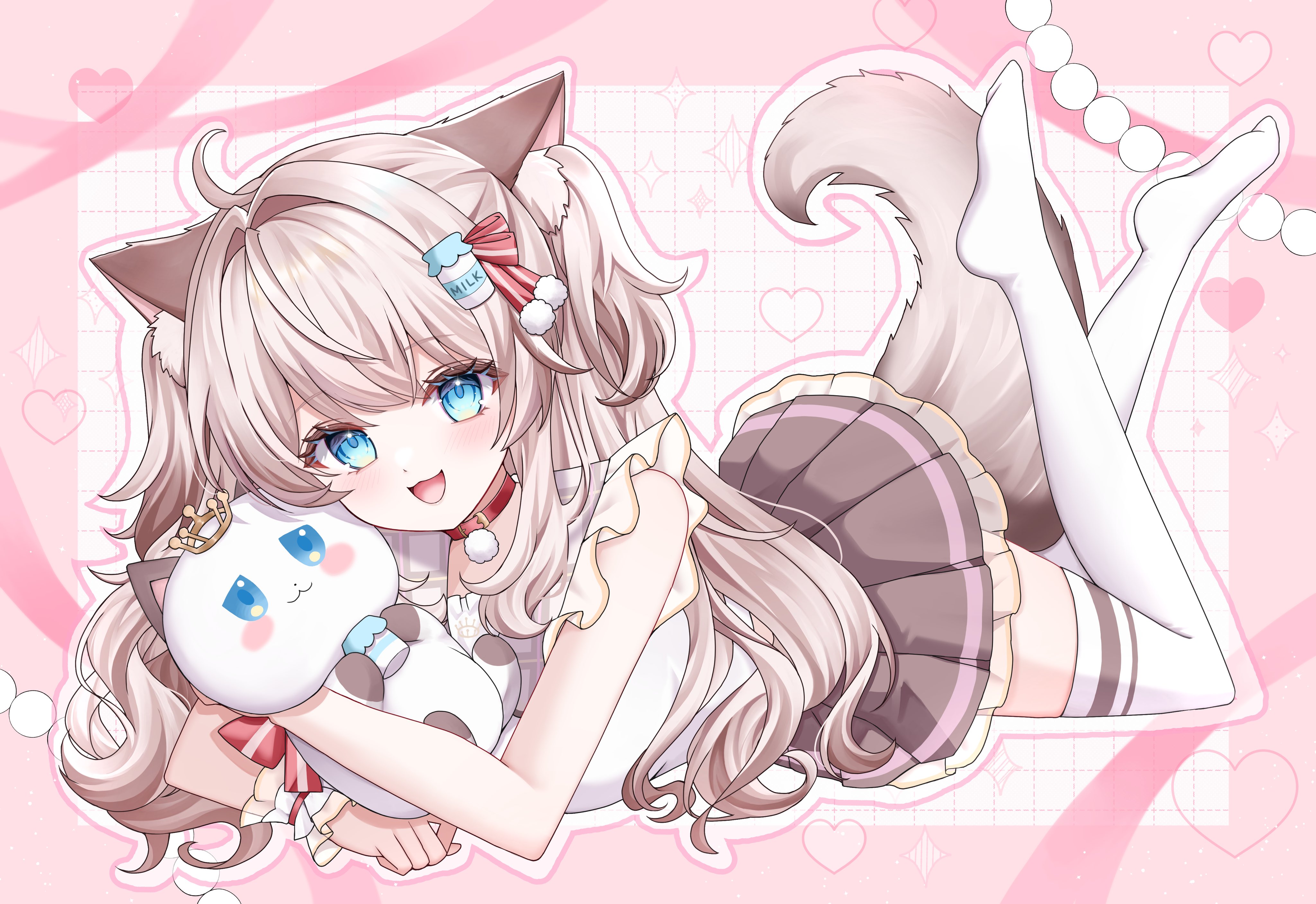 1girl absurdres ahoge animal animal_ear_fluff animal_ears blue_eyes bottle_hair_ornament brown_hair brown_skirt cat cat_ears cat_girl cat_tail choker commentary_request commission frilled_shirt frilled_skirt frills full_body grid_background hair_ornament hair_ribbon heart heart_background highres holding holding_animal holding_cat indie_virtual_youtuber long_hair lying nekome_milk on_stomach pink_background pleated_skirt pom_pom_(clothes) pom_pom_hair_ornament red_choker red_ribbon ribbon shirt skeb_commission skirt sleeveless sleeveless_shirt tail the_pose thighhighs two_side_up uyu_beliasff14 virtual_youtuber white_background white_shirt white_thighhighs white_wrist_cuffs wrist_cuffs zettai_ryouiki