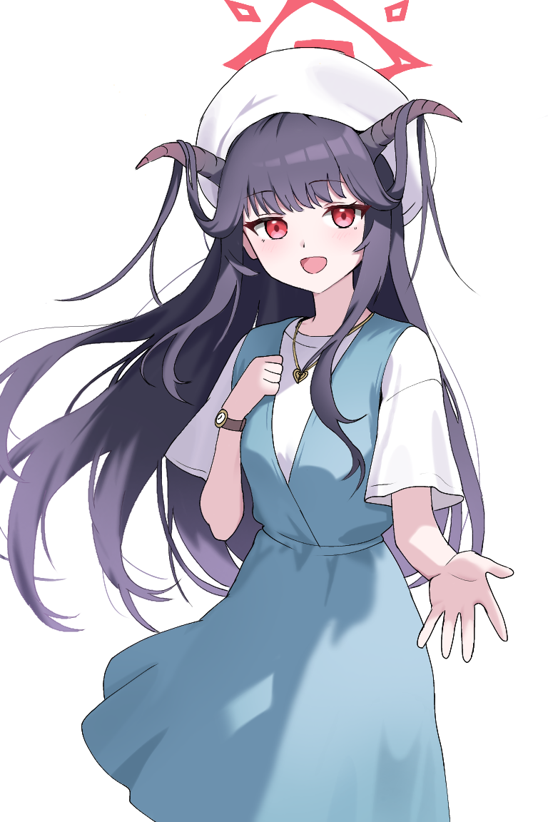1girl black_hair blue_archive blue_dress blush breasts commentary demon_girl demon_horns dress english_commentary fuuka_(blue_archive) fuuka_(casual)_(blue_archive) halo hat heart heart_necklace heart_pendant horns jewelry long_hair looking_at_viewer necklace official_alternate_costume official_alternate_hairstyle open_mouth potgit red_eyes red_halo shirt short_sleeves simple_background small_breasts smile solo watch white_background white_hat white_shirt wristwatch