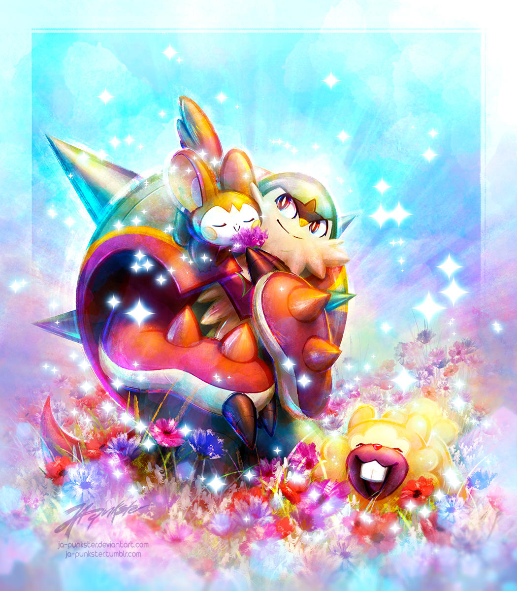 :3 alternate_color bidoof buck_teeth chesnaught closed_eyes closed_mouth commentary deviantart_username emolga english_commentary flower gen_4_pokemon gen_5_pokemon gen_6_pokemon highres holding holding_flower joannazelle nintendo on_shoulder pink_flower pokemon pokemon_(creature) pokemon_focus pokemon_on_shoulder purple_flower red_eyes shiny_pokemon signature smelling smelling_flower smile sparkle spikes split_mouth teeth tumblr_username watermark web_address white_background