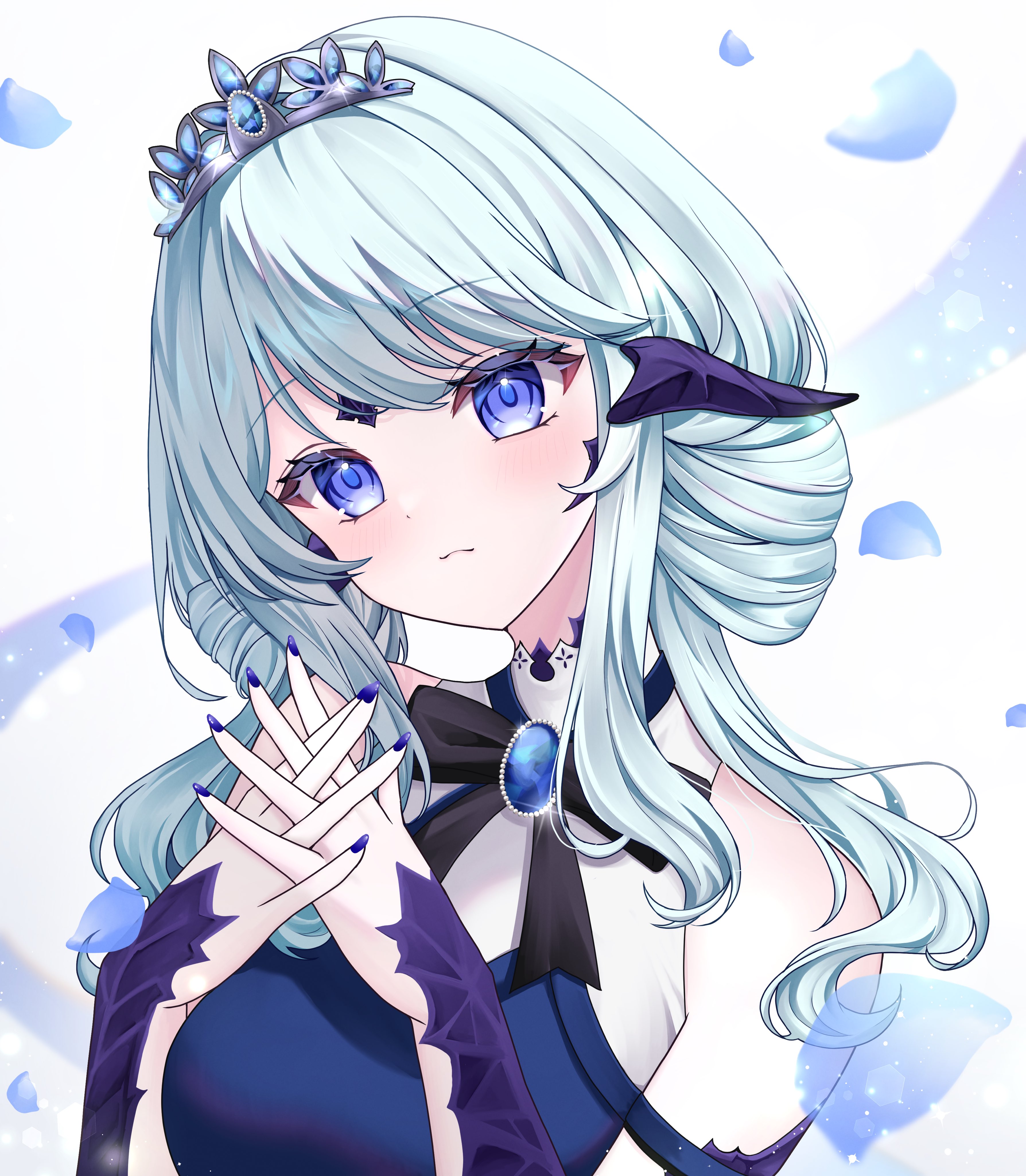 1girl absurdres au_ra bare_shoulders black_bow black_bowtie blue_dress blue_eyes blue_hair blue_nails bow bowtie brooch closed_mouth commentary_request dragon_horns dress falling_petals final_fantasy final_fantasy_xiv highres horns jewelry medium_hair nail_polish off-shoulder_dress off_shoulder petals scales solo tiara upper_body uyu_beliasff14 warrior_of_light_(ff14) white_background