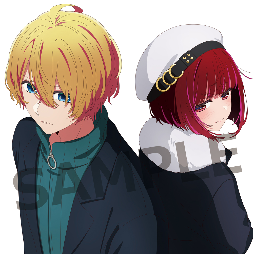 aqua_sweater arima_kana black_jacket blonde_hair blue_eyes closed_mouth commentary_request fur-trimmed_jacket fur_trim hat hirayama_kanna hoshino_aquamarine jacket medium_hair official_art oshi_no_ko red_eyes red_hair sample_watermark short_hair sweater watermark white_background white_hat
