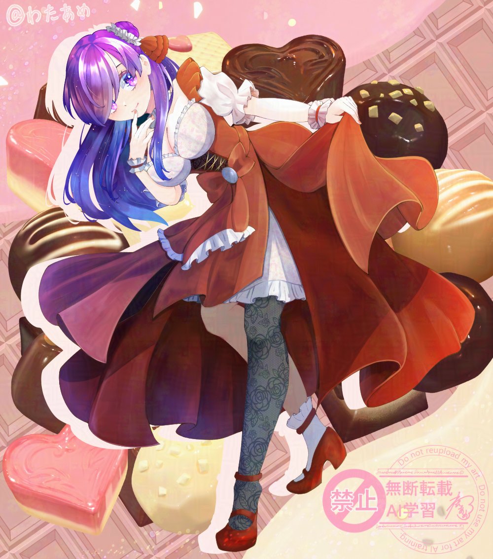 1girl alternate_costume candy chocolate chocolate_heart commentary_request dress female_shez_(fire_emblem) fire_emblem fire_emblem:_three_houses fire_emblem_warriors:_three_hopes food fuwafuwa014wata hair_bun hair_over_one_eye heart heart-shaped_food nintendo purple_eyes purple_hair single_hair_bun