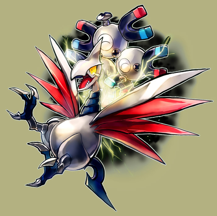 closed_eyes commentary_request electricity gen_1_pokemon gen_2_pokemon kantarou_(8kan) lower_teeth_only magnet magneton metal_skin nintendo no_humans open_mouth pokemon pokemon_(creature) pokemon_focus screw sharp_teeth skarmory tearing_up teeth type_effectiveness