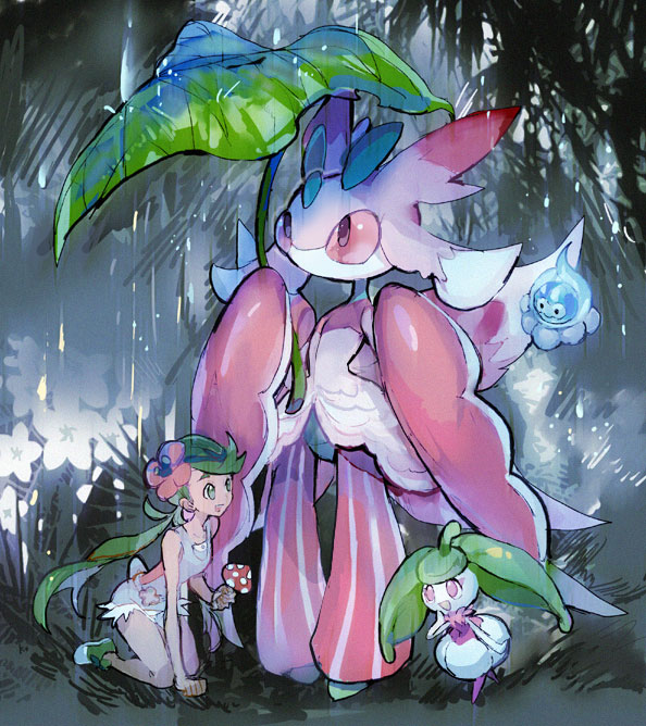 1girl big_mushroom_(pokemon) castform castform_(rainy) commentary_request floating flower gen_3_pokemon gen_7_pokemon green_eyes green_hair green_shoes grey_overalls hair_flower hair_ornament headband holding holding_leaf holding_mushroom kantarou_(8kan) kneeling leaf leaf_umbrella long_hair lurantis mallow_(pokemon) mushroom nature nintendo open_mouth outdoors overall_shorts overalls pink_eyes pink_flower pokemon pokemon_sm rain shoes smile standing steenee twintails
