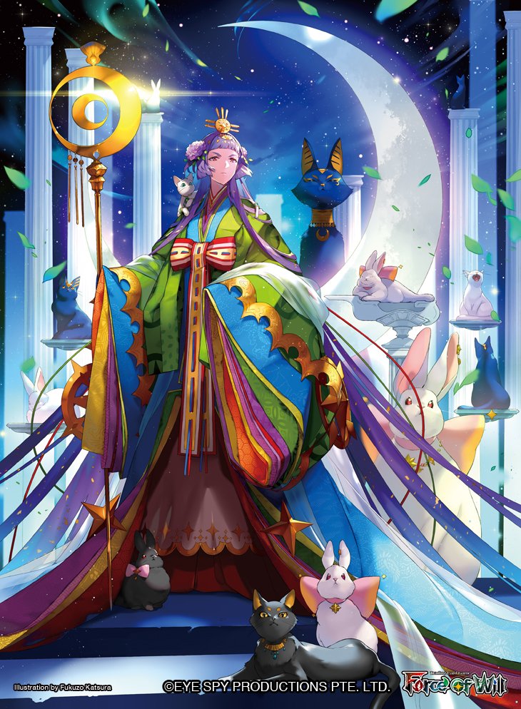 1girl black_cat black_rabbit_(animal) cat closed_mouth commentary falling_leaves flower force_of_will fukuzou full_body glint green_leaf hair_flower hair_ornament half_moon holding holding_staff holding_weapon japanese_clothes kaguya_(force_of_will) karaginu_mo kimono leaf long_hair low_twintails moon multiple_others official_art orange_eyes pillar purple_hair rabbit ribbon staff star_(sky) star_(symbol) stone_pillar twintails weapon white_rabbit_(animal) wide_sleeves