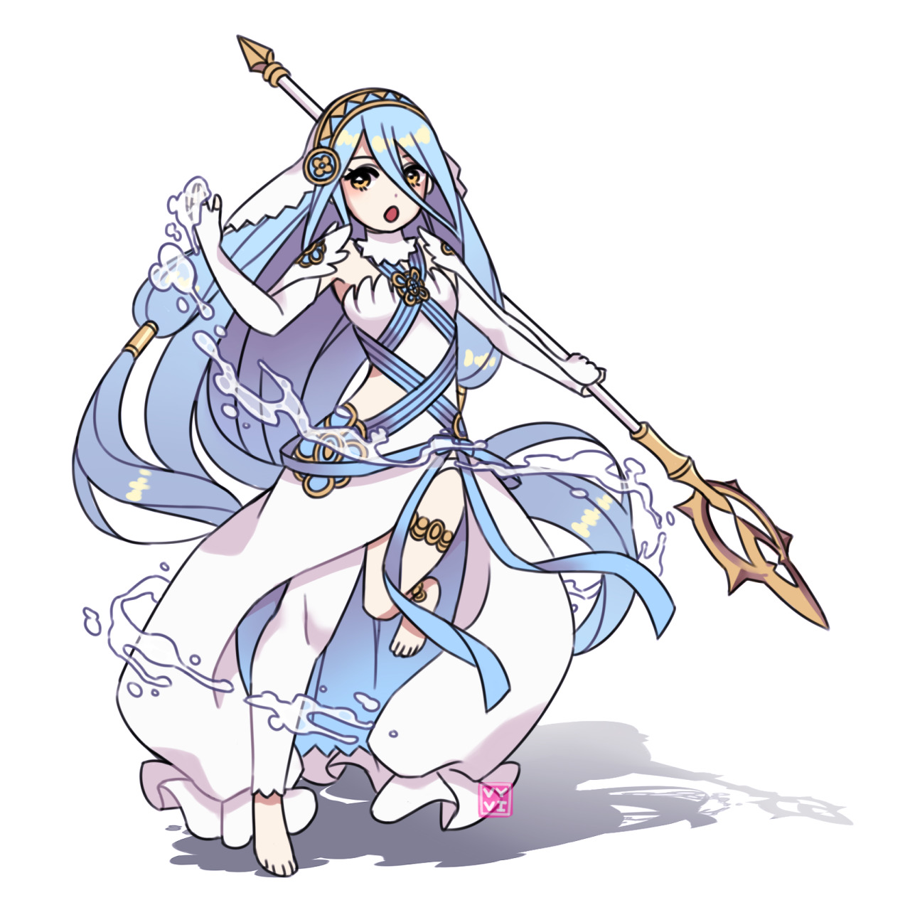 1girl azura_(fire_emblem) barefoot blue_hair commentary elbow_gloves english_commentary fire_emblem fire_emblem_fates gloves hair_between_eyes highres holding holding_polearm holding_weapon jewelry long_hair looking_at_viewer nintendo pendant polearm solo very_long_hair vyvii-blog1 water weapon yellow_eyes