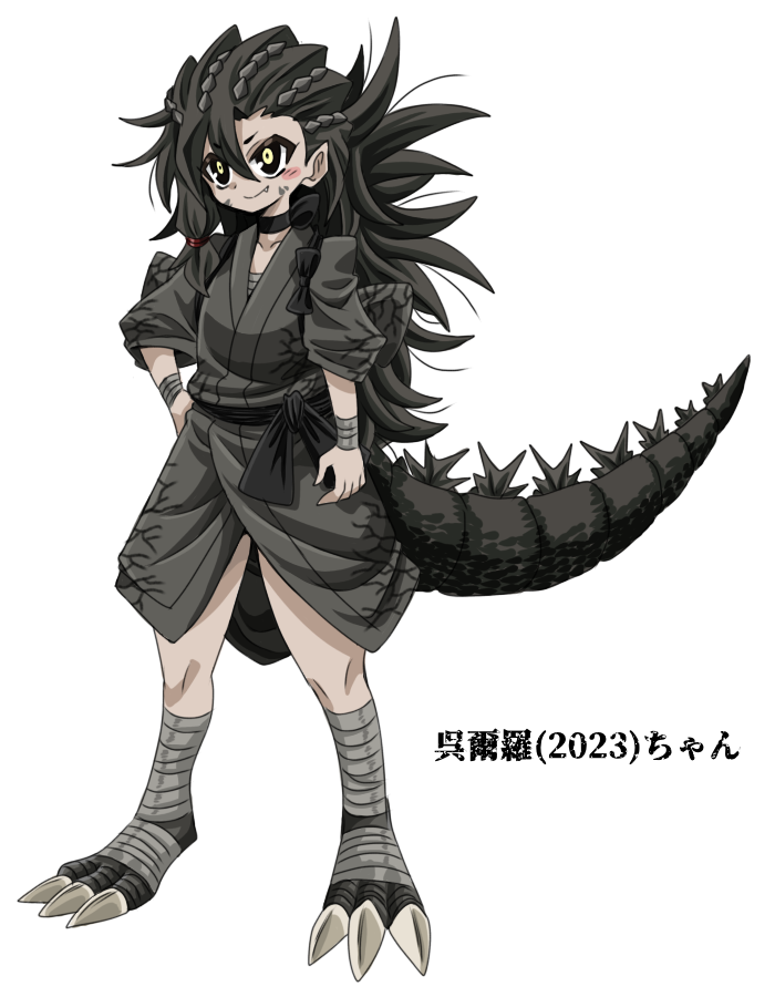 1girl 2023 animal_feet bandaged_ankle bandaged_arm bandaged_breasts bandaged_chest bandaged_foot bandaged_leg bandaged_wrist bandages black_hair black_sclera character_name claws collar colored_sclera cosplay dinosaur_feet dinosaur_girl dinosaur_tail facial_scar fang fang_out genderswap genderswap_(mtf) godzilla godzilla_(cosplay) godzilla_(series) godzilla_minus_one japanese_clothes japanese_text kaiju kimono kinkuri_(axsc8mjrt) long_hair monster_girl personification scar scar_on_cheek scar_on_face sharp_teeth simple_background smile spikes tail teeth toho vein_print very_long_hair white_background yellow_eyes