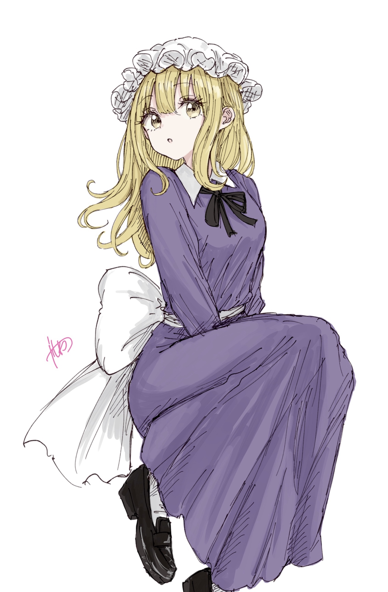 1girl :o back_bow black_ribbon black_shoes blonde_hair bow collared_dress commentary contrast_collar dress highres invisible_chair kashiwada_kiiho large_bow long_dress long_hair maribel_hearn neck_ribbon open_mouth own_hands_together purple_dress ribbon sash shoes signature simple_background sitting socks solo touhou untranslatable_commentary white_background white_sash white_socks yellow_eyes