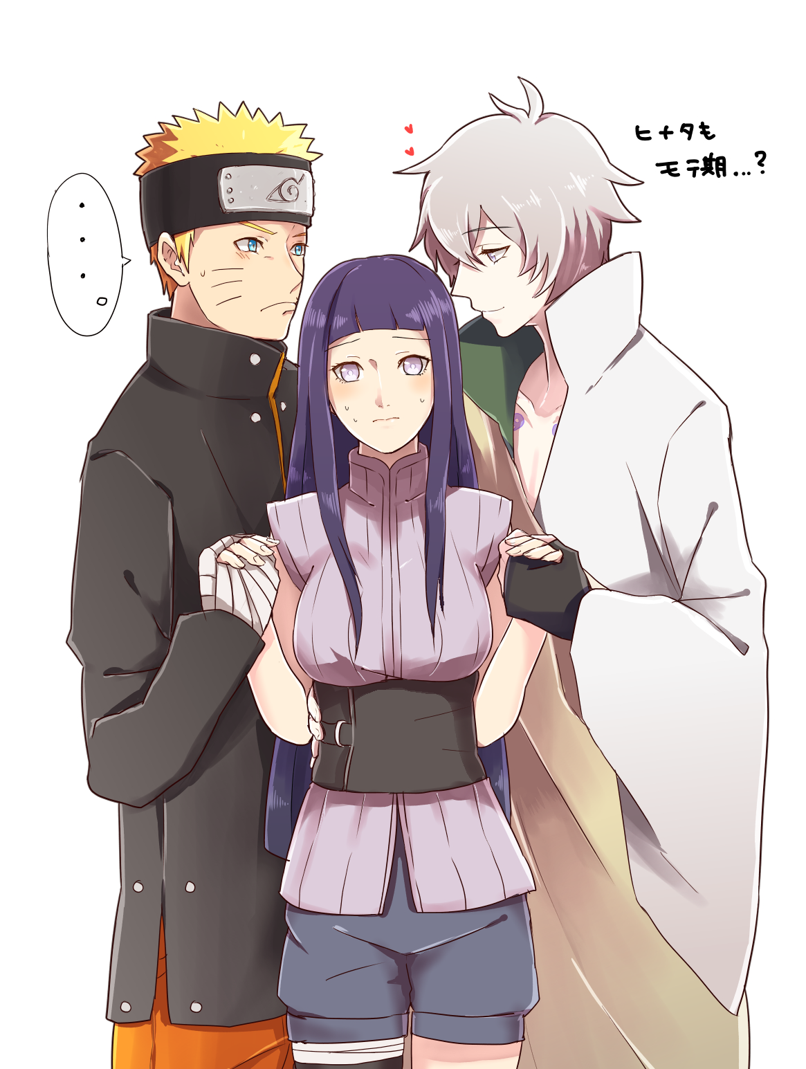 ... 1girl 2boys alternate_costume angry annoyed bandaged_arm bandaged_hand bandages bare_arms bare_shoulders black_gloves blonde_hair blue_eyes blunt_bangs blush chest_tattoo closed_mouth collarbone curly_hair embarrassed fingerless_gloves gloves grey_eyes group_sex hair_between_eyes headband hetero high_collar highres holding_hands hyuuga_hinata jacket japanese_clothes light_blush light_smile long_sleeves looking_at_another looking_down looking_to_the_side mitsudomoe_(shape) mmf_threesome multiple_boys multiple_girls naruto:_the_last naruto_(series) nervous_sweating ootsutsuki_toneri pixiv_12279487 purple_eyes purple_hair second-party_source shade shorts sleeveless speech_bubble standing sweat tattoo threesome tomoe_(symbol) translation_request upper_body uzumaki_naruto whiskers white_hair
