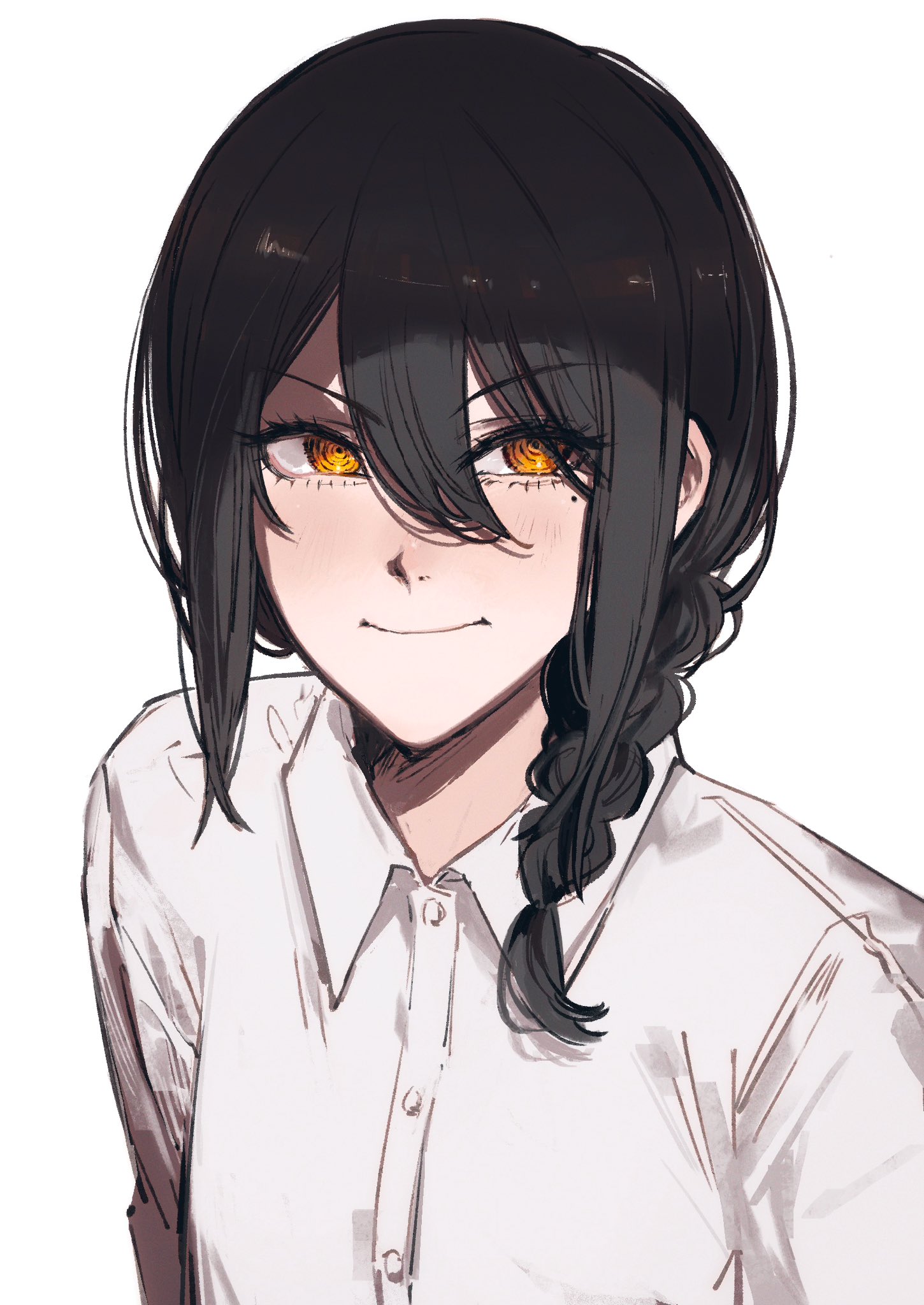 1girl black_hair braid braided_ponytail chainsaw_man closed_mouth dodo_(dodobo) highres nayuta_(chainsaw_man) orange_eyes shirt simple_background smile white_background white_shirt
