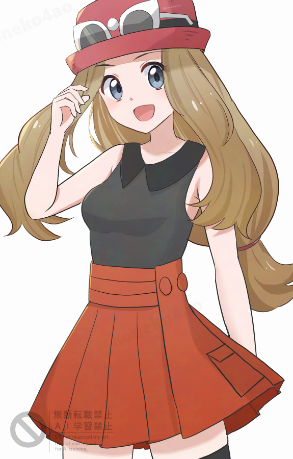 1girl :d aoneko4ao_(edwf7745) black_thighhighs brown_hair collared_shirt commentary cowboy_shot eyewear_on_headwear grey_eyes hand_up happy hat long_hair looking_at_viewer nintendo open_mouth pleated_skirt pokemon pokemon_x_and_y red_hat red_skirt serena_(pokemon) shirt simple_background skirt sleeveless sleeveless_shirt smile solo sunglasses thighhighs watermark white_background