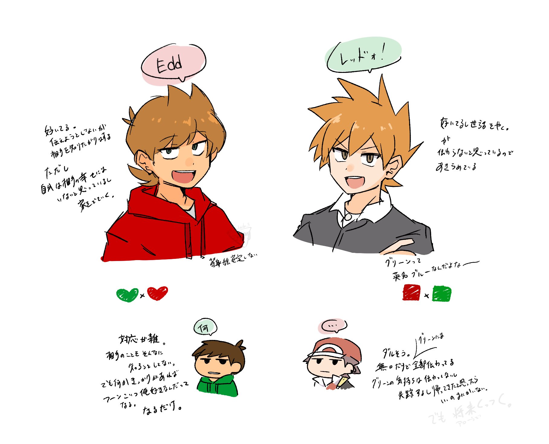 ... 4boys :d animification antenna_hair baseball_cap black_shirt blue_oak brown_hair character_name collared_shirt color_connection commentary comparison crossover drawstring edd_(eddsworld) eddsworld flipped_hair green_hoodie grey_eyes hair_ears hat heart highres hood hood_down hoodie jitome kanagu layered_clothes looking_at_viewer male_focus multiple_boys nintendo open_mouth pokemon pokemon_firered_and_leafgreen pokemon_heartgold_and_soulsilver red_(pokemon) red_hat red_hoodie shirt simple_background smile speech_bubble spoken_ellipsis tord_(eddsworld) translation_request white_background white_shirt yaoi
