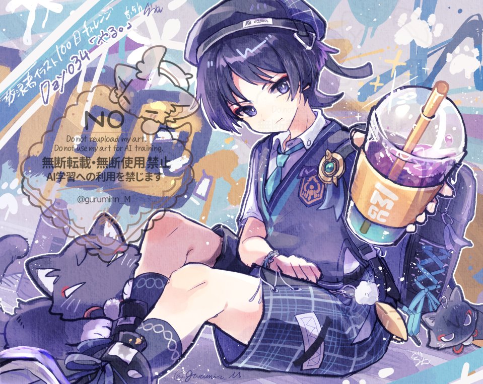 1boy animalization aqua_gem aqua_trim backpack bag bead_bracelet beads beret black_cat black_hair black_hat black_shoes black_socks blue_necktie blue_ribbon bracelet bright_pupils cat clenched_hand closed_mouth collared_shirt colored_tips commentary_request contemporary cup disposable_cup drinking_straw emblem eyeliner gem genshin_impact gold graffiti gurumin_(gurruguru) hand_on_own_thigh hand_up hat holding holding_cup incoming_gift jewelry light_smile looking_at_viewer makeup male_focus multicolored_hair necktie official_alternate_costume parted_bangs person_and_animalization plaid_clothes plaid_shorts purple_bag purple_eyes purple_hair purple_shorts purple_trim purple_vest red_eyeliner ribbon scaramouche_(cat)_(genshin_impact) scaramouche_(genshin_impact) school_uniform shirt shoes shorts sitting sneakers socks solo stuffed_animal stuffed_toy tsurime twitter_username undershirt vest wanderer_(genshin_impact) wanderer_(mega_mgc_coffee)_(genshin_impact) watermark white_pupils white_shirt wing_collar