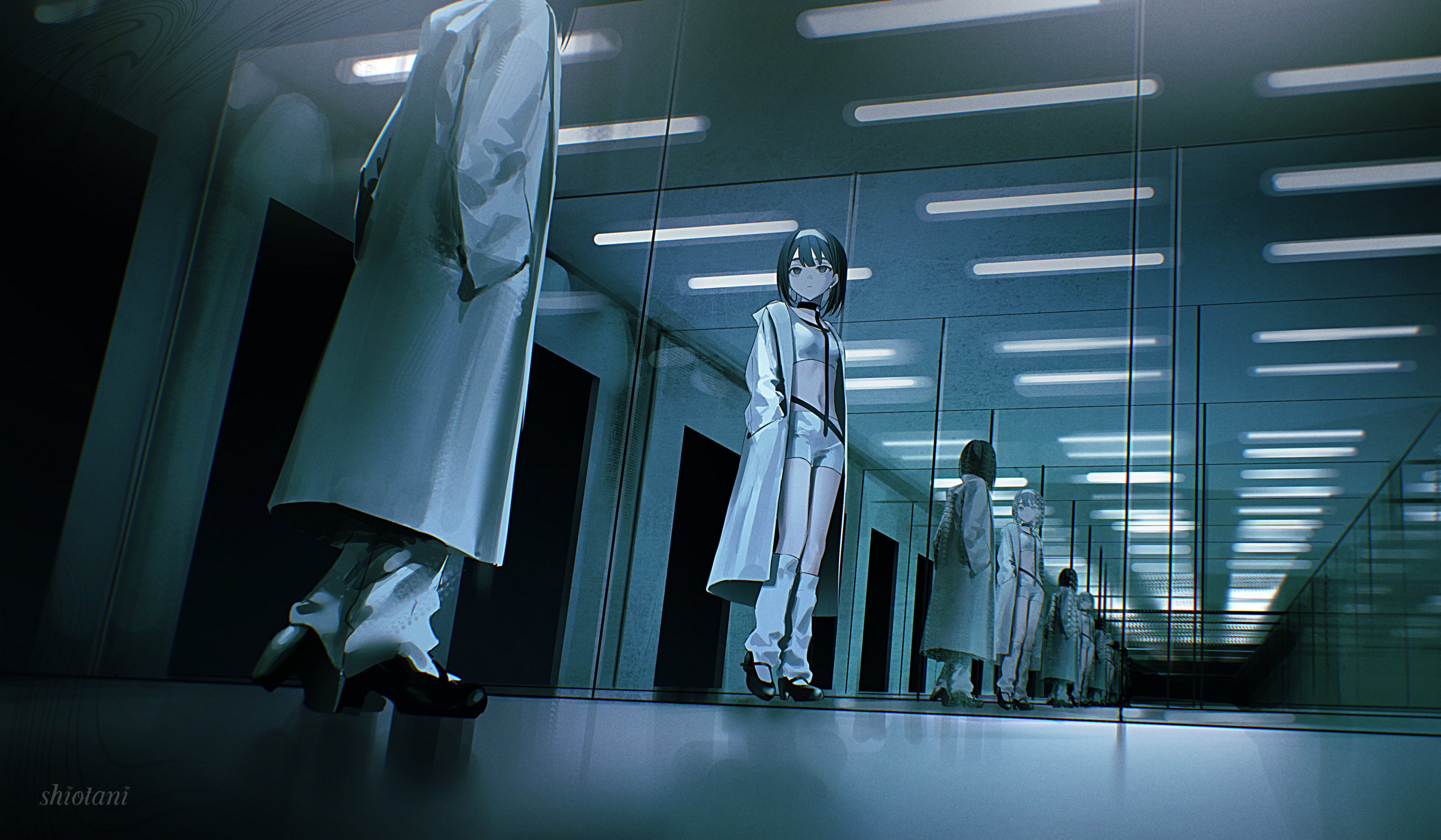 artist_name black_hair black_shoes collar commentary crop_top hands_in_pockets headband highres jacket leash looking_at_reflection loose_socks mary_janes mirror original recursion reflection shirt shoes short_hair shorts siotanikun socks white_headband white_jacket white_shirt white_shorts white_socks