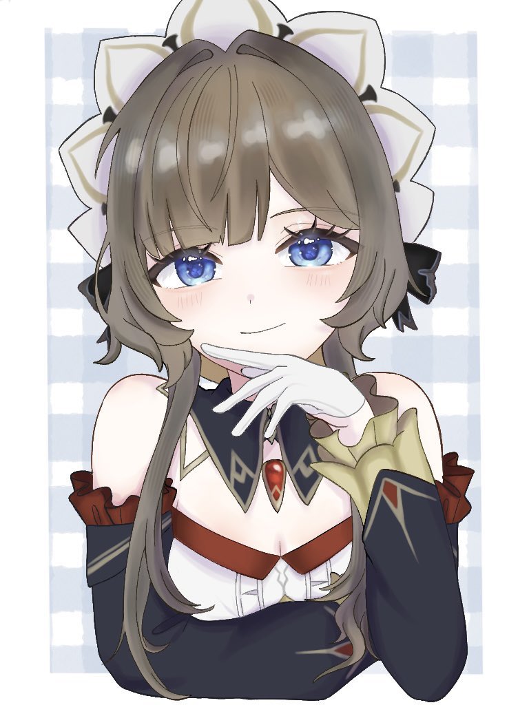 1girl bare_shoulders black_collar black_sleeves blue_eyes blush bonnet breasts brown_hair checkered_background collar commentary detached_collar detached_sleeves dress gem genshin_impact gloves hair_ornament hand_on_own_chin hi_suix2 long_sleeves looking_at_viewer red_gem sandrone_(genshin_impact) short_hair_with_long_locks simple_background smile solo untranslatable_commentary upper_body white_gloves white_headdress
