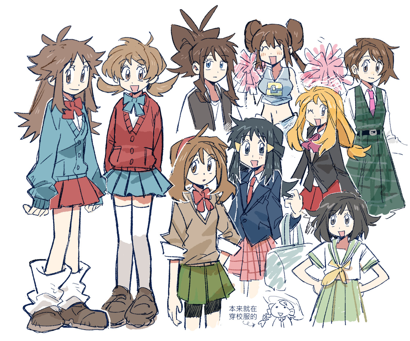 6+girls blue_eyes bow brown_hair crossover dawn_(pokemon) desegnajo649 everyone gloria_(pokemon) hilda_(pokemon) juliana_(pokemon) leaf_(pokemon) long_hair long_sleeves lyra_(pokemon) may_(pokemon) missing_headwear multiple_girls nintendo pokemon pokemon_black_and_white pokemon_black_2_and_white_2 pokemon_diamond/pearl/platinum pokemon_firered_and_leafgreen pokemon_heartgold_and_soulsilver pokemon_omega_ruby_and_alpha_sapphire pokemon_sun_and_moon pokemon_scarlet_and_violet pokemon_sword_and_shield pokemon_x_and_y rosa_(pokemon) school_uniform selene_(pokemon) serafuku serena_(pokemon) short_hair skirt smile thighhighs twintails