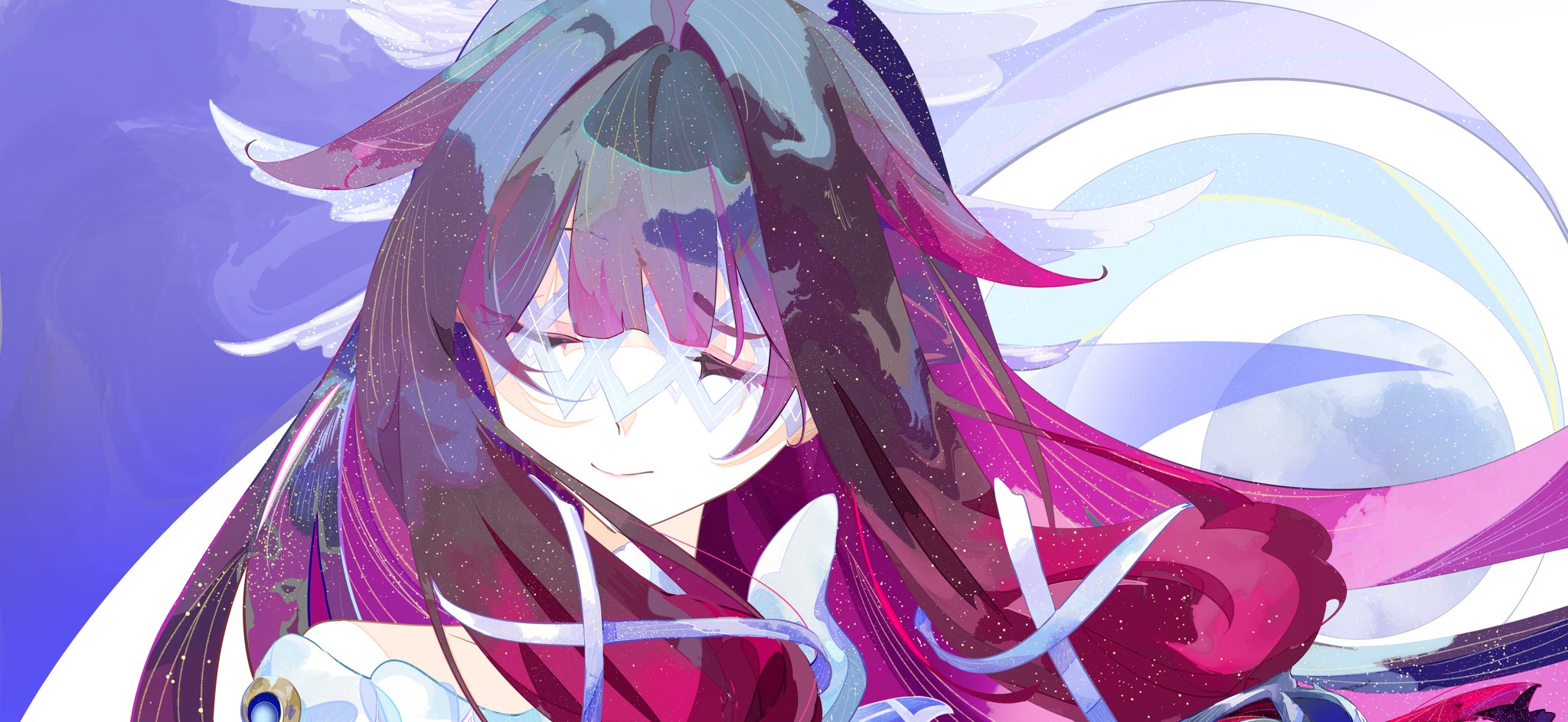 1girl bare_shoulders black_hair closed_eyes columbina_(genshin_impact) commentary crescent eye_mask genshin_impact givre hair_ornament head_wings highres long_hair mask moon multicolored_hair multiple_wings portrait purple_hair purple_streaks ribbon smile solo streaked_hair two-tone_hair untranslatable_commentary very_long_hair white_wings wing_hair_ornament wings x-shaped_eyewear