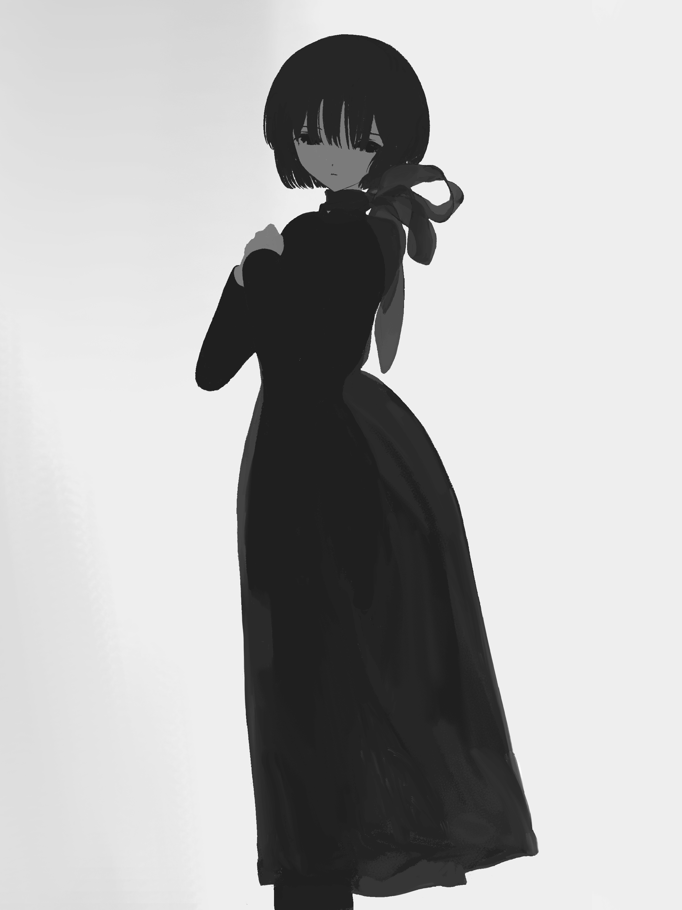 1girl absurdres bow bow_choker choker closed_mouth dress expressionless feet_out_of_frame from_side grey_background greyscale hands_up highres looking_at_viewer looking_to_the_side monochrome no_pupils original own_hands_together see-through_clothes short_hair solo standing yuruunnti