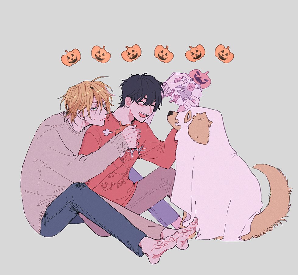 2boys a_co_pi animal arm_up ash_lynx banana_fish barefoot black_hair blonde_hair brown_pants commentary_request dog ghost_costume golden_retriever grey_background grey_sweater hair_between_eyes halloween holding jack-o'-lantern long_sleeves looking_at_animal male_focus multiple_boys okumura_eiji open_mouth pants red_shirt round_teeth shirt sitting sleeves_past_wrists smile sweater teeth